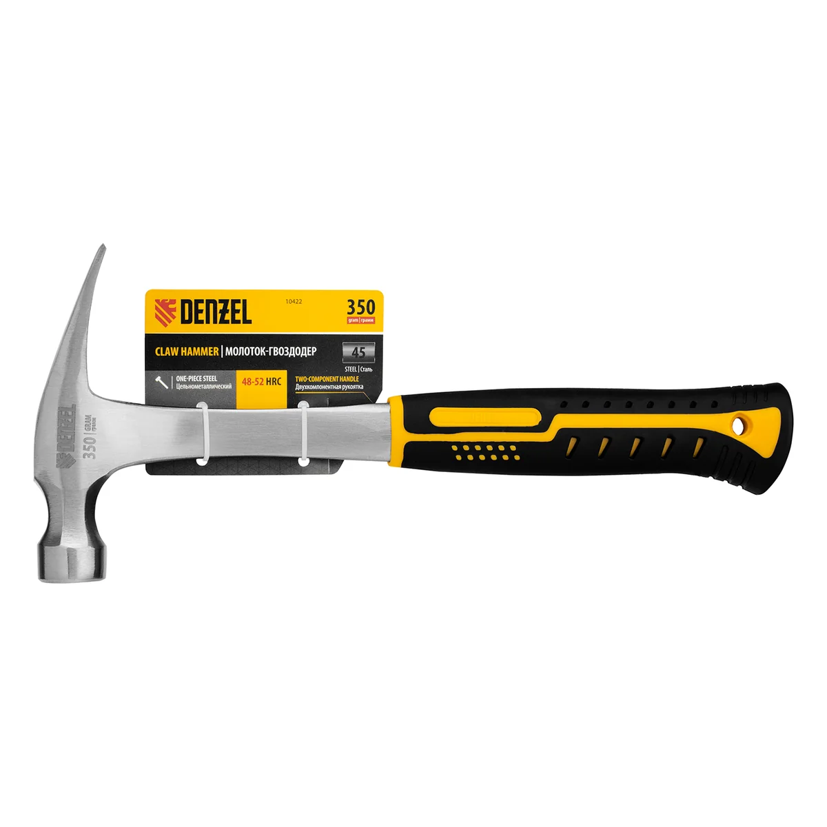 Цельнометаллический молоток-гвоздодер Denzel 10422 с головкой весом 350 г и двухкомпонентной рукояткой предназначен для забивания и извлечения гвоздей. Рекомендован как для домашнего, так и для профессионального применения, пригодится в слесарной мастерской, на даче, в гараже.ПреимуществаПрочность — молоток изготовлен из стали 45 методом ковки.Долговечность — рабочие части закалены до твердости 45-50 HRC и выдерживают многократные динамические нагрузки без риска деформации и быстрого износа.Надежная конструкция — поломка цельнометаллического молотка исключена.Комфортная и безопасная эксплуатация — обрезиненная эргономичная рукоятка обеспечивает надежный хват.