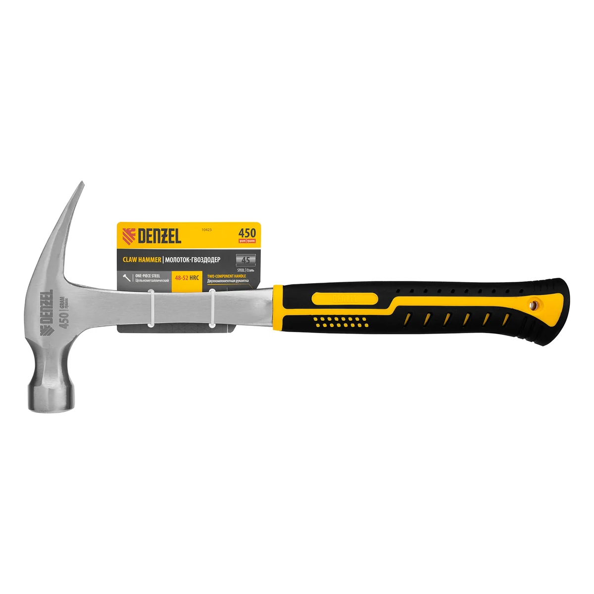 Цельнометаллический молоток-гвоздодер Denzel 10423 с головкой весом 450 г и двухкомпонентной рукояткой предназначен для забивания и извлечения гвоздей. Рекомендован как для домашнего, так и для профессионального применения, пригодится в слесарной мастерской, на даче, в гараже.ПреимуществаПрочность — молоток изготовлен из стали 45 методом ковки.Долговечность — рабочие части закалены до твердости 45-50 HRC и выдерживают многократные динамические нагрузки без риска деформации и быстрого износа.Надежная конструкция — поломка цельнометаллического молотка исключена.Комфортная и безопасная эксплуатация — обрезиненная эргономичная рукоятка обеспечивает надежный хват.