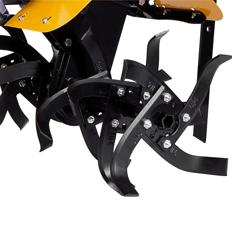 Самый эффективный из представленных в линейке, мотоблок Denzel DPT-370-PRO 56404 мощностью 7 л.с. рассчитан на участки площадью до 1-2 гектаров. Сырой или вязкий грунт, глинистая почва, целина или большое поле — все эти задачи под силу четырехтактному двигателю Denzel.Для рыхления, измельчения или выравнивания почвы используются 24 фрезы диаметром 35 см. Их обслуживание сведено к минимуму и не требует повторной заточки. Режущие элементы без труда уходят на глубину 35 см и захватывают до 90 см в ширину.Преимущества4 скорости вперед и 2 назад — несколько режимов работы помогут справиться с почвой любого типа, маневрируя в узких местах, и без труда вытащить мотоблок даже из сложного грунта.Длительная обработка почвы — емкий топливный бак на 6 л и двигатель из серии Denzel Long Life обеспечивают экономичное потребление бензина (примерно 1 л/час) и позволяют обработать большую территорию, не теряя времени на дозаправку.Высокая производительность — надежные фрезы из закаленной стали обеспечивают оптимальную скорость вспахивания даже слежавшейся земли.Широкий спектр задач — благодаря надежному механизму сцепления на мотоблок легко закрепляются дополнительные фрезы, тележки, приспособления для высадки клубней и сбора урожая, косилки и прочая вспомогательная техника.Настройка глубины вспахивания — сошник регулируется по высоте и позволяет погружать почвофрезы на глубину до 35 см, идеально обрабатывая разные участки земли, и дополнительно обеспечивая устойчивость мотоблока.Система LO-protection — двигатель не заведется при недостаточном уровне масла, что гарантирует его сохранность и повышает ресурс работы всего мотоблока.Долговечность — стальной коленвал, закаленный до твердости 45-50 HRС в паре с качественно отлитым распредвалом гарантируют надежную и стабильную работу независимо от типа почвы и времени года.Безопасная работа — специальный щиток ограждает пользователя от попадания земли, грязи и посторонних предметов.Усиленная конструкция — рама надежно защищает мотоблок от механических повреждений и способна выдержать длительную эксплуатацию даже в зимнее время.Устойчивость на любом грунте — мотоблок отцентрован на заводе и отлично удерживает равновесие, поэтому подойдет даже неопытным пользователям.Эргономика в деталях — рукоятки изогнутой формы обеспечивают удобный захват, находятся на оптимальном расстоянии друг от друга, усилены металлической перекладиной и гасят вибрации благодаря прорезиненным наконечникам.Удобство эксплуатации — основные элементы управления вынесены на рукоятки, поэтому оператор сможет быстро настроить оптимальный режим под тип грунта, не наклоняясь.Уверенное сцепление с любой поверхностью — пневматические колеса диаметром 49 см защищены от проколов протекторами и обеспечивают хорошую амортизацию, поэтому пройти получится даже по неровному участку, не боясь за оборудование.Быстрая заправка без брызг — горловина топливного бака увеличена, что сокращает время на его заполнение и позволяет избежать разбрызгивания бензина.Расширенная гарантия 3 года — качество мотоблока подтверждено производителем.