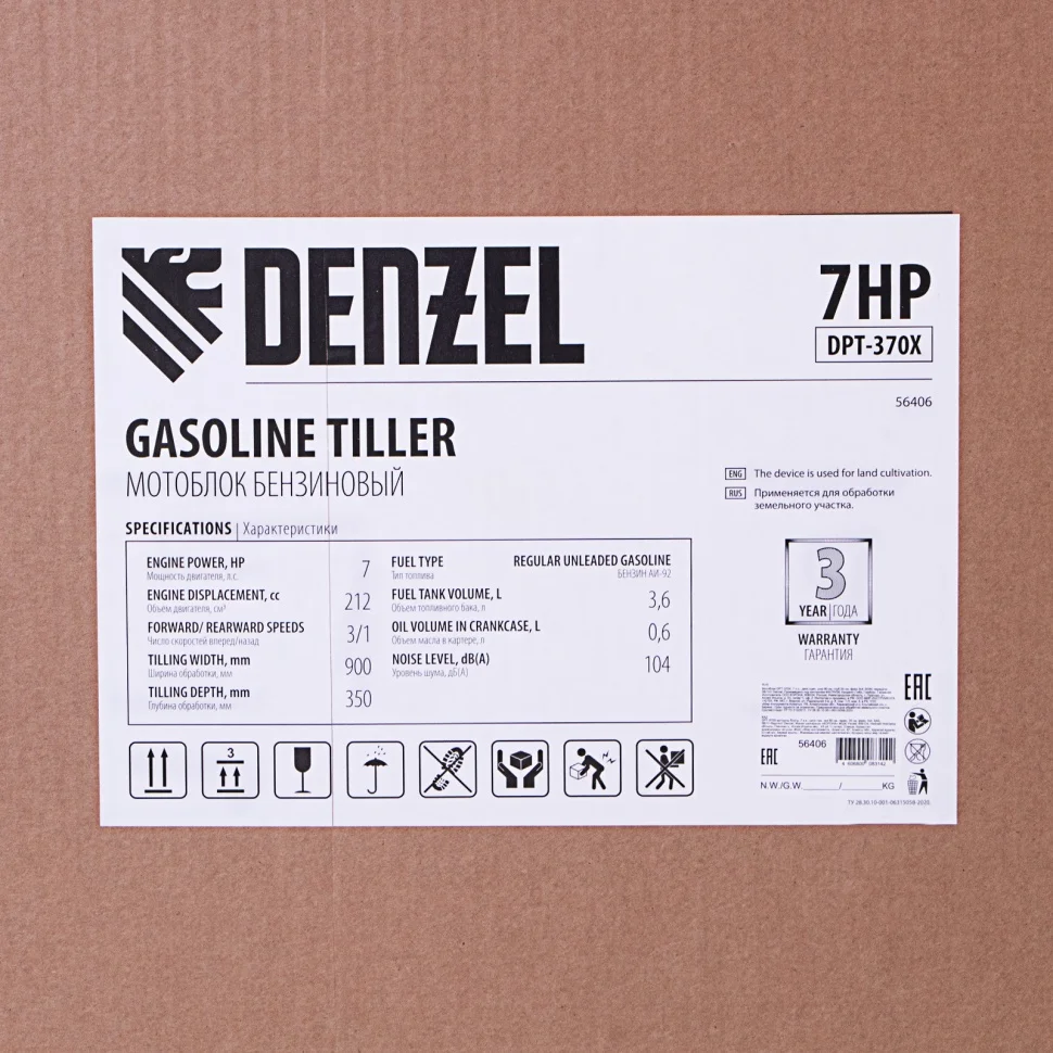 Мотоблок Denzel 56406 DPT-370X мощностью 7 л.с., с дисковым сцеплением, фрезами 3 х 4, валом отбора мощности (ВОМ), передачами 3В/1Н, имеет ширину вспахивания 90 см и глубину обработки 35 см. Предназначен для обработки почвы: рыхления, боронования, выравнивания, прополки и выполнения других задач на приусадебных и садовых участках, уверенно справляется с плотной глинистой почвой.Мощный и экономичный одноцилиндровый четырехтактный двигатель Denzel серии Long Life с рабочим объемом 212 см3 отличается надежностью и продолжительным ресурсом. Многодисковый механизм сцепления обеспечивает передачу высокого крутящего момента на колеса. Мотоблок предназначен для работы на большой территории и широко используется в быту.ПреимуществаВысокопроизводительная коробка передач — 3 передачи вперед и одна назад позволяют подстраиваться под тип почвы и легко извлекать почвофрезы из любого грунта.Удобная эксплуатация — рукоятки руля регулируются в 2 плоскостях — вертикально и относительно продольной оси машины.Легкое управление — регулятор оборотов двигателя, выключатель зажигания и рычаг сцепления находятся на рукоятке перед пользователем.Усиленный сошник толщиной 12 мм — можно менять глубину вспахивания, удерживать равновесие при обработке почвы и использовать его в качестве задней опоры при хранении мотоблока.Многофункциональность и экономия бюджета — вал отбора мощности позволяет подключать к мотоблоку активное навесное оборудование.Защита от работы при низком уровне масла LO-protection — мотоблок не включится при незаполненном картере, такое решение предотвращает поломку двигателя и продлевает срок службы техники.Безопасная работа — широкие крылья защищают пользователя от вылетающих фрагментов почвы, камней и прочих предметов.Низкий расход топлива 1 л/ч — можно непрерывно работать более 3-х часов, не отвлекаясь на заправку.Долговечность — чугунный корпус редуктора и стальные фрезы (в комплекте поставки 24 шт.) отличаются особой прочностью.Надежный карбюратор — мотоблок работает стабильно даже при высокой нагрузке на двигатель.Качественные детали — закаленный до твердости 45-50 HRС стальной коленвал и надежный распредвал обеспечивают высокую производительность мотоблока в любое время года.Воздушный фильтр — поступающий в цилиндр воздух очищается от твердых частиц, что обеспечивает его высокий ресурс — это особенно важно при обработке сухой почвы.Эргономичность — рукоятки изогнутой формы находятся на оптимальном расстоянии друг от друга и усилены стальной перекладиной, поэтому пользователь не устанет даже при длительной работе.Комфортная транспортировка — усиленная рукоятка-бампер и большие колеса с глубоким протектором позволяют с легкостью перемещать мотоблок до нужного места.Складная ножка — дополнительная опора позволяет удобно располагать мотоблок в зоне хранения без риска опрокидывания.Расширенная гарантия 3 года — качество мотоблока подтверждено производителем.