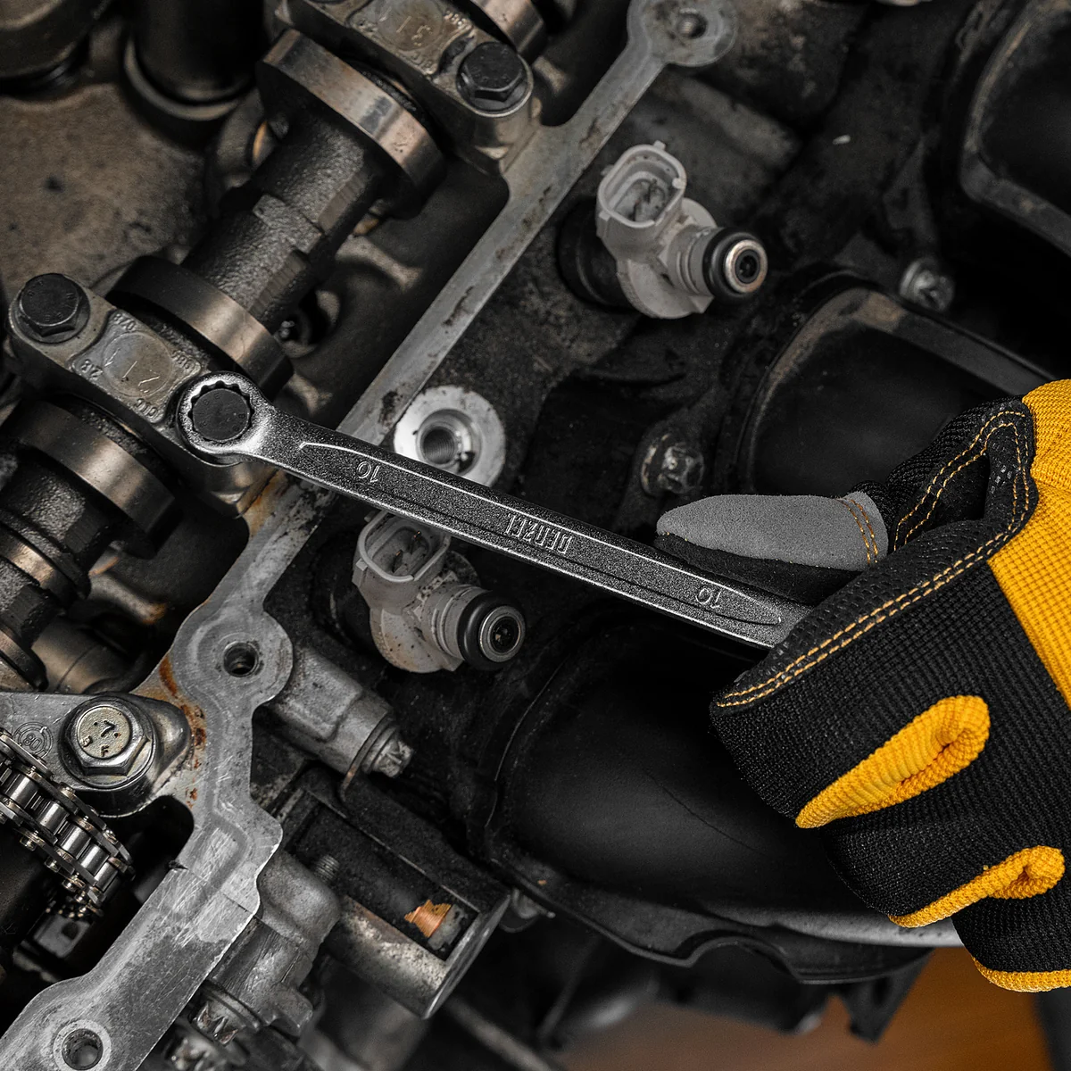 - Удобная работа в труднодоступных местах — 90-зубый храповой механизм ключей-трещоток обеспечивает плавный ход, угол поворота составляет всего 4°.