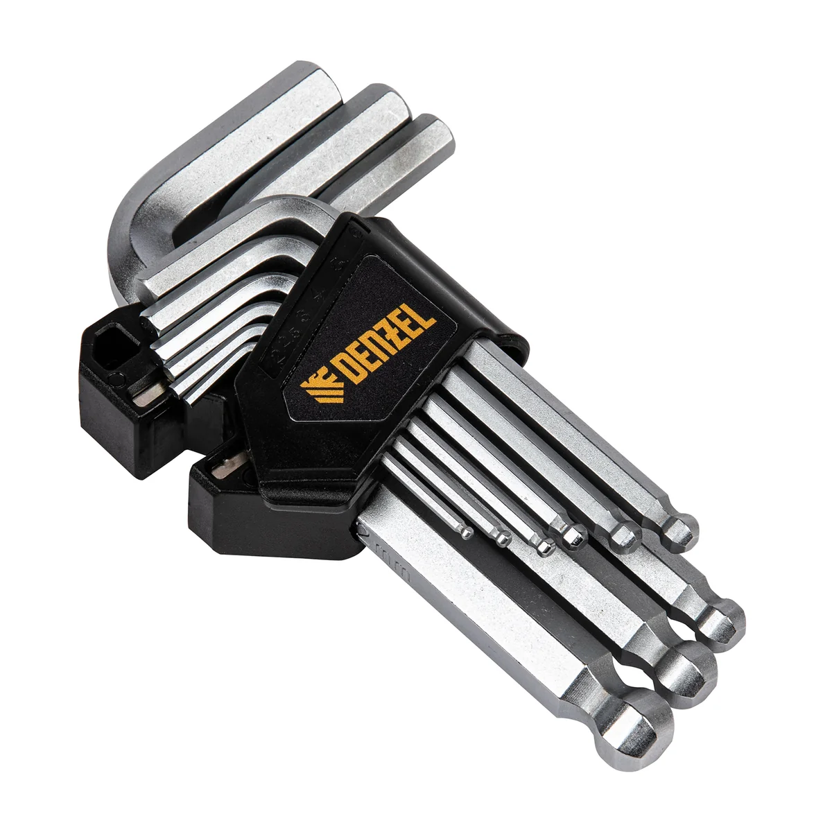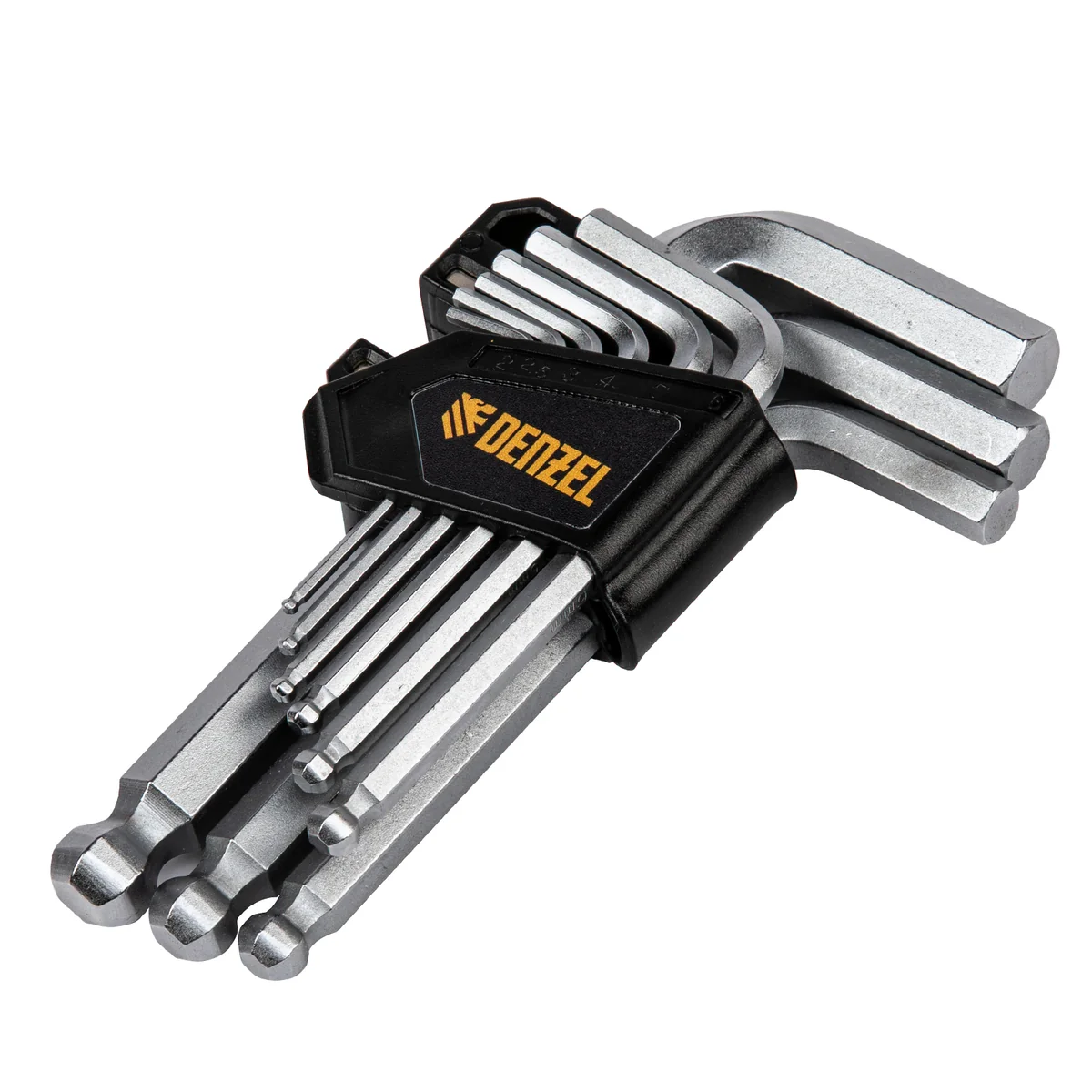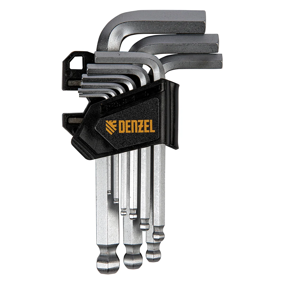 Набор Denzel 12363 включает в себя 9 имбусовых ключей из стали CrV размером 2-12 мм, с шаром, предназначенных для закручивания и откручивания крепежей со шлицем типа HEX. Шарообразные наконечники можно вставлять в головку крепежа под углом, что облегчает работу в ограниченном пространстве. Набор пригодится для ремонта велосипедов, сборки мебели и монтажа различных конструкций.ПреимуществаПрочность — ключи из хромованадиевой стали твердостью 52-55 HRC легко справляются даже с заржавевшими крепежами.Коррозионная стойкость — хромированное покрытие защищает ключи от разрушения.Комфортная работа — благодаря двойному магниту ключи надежно фиксируются в шлице евровинтов.