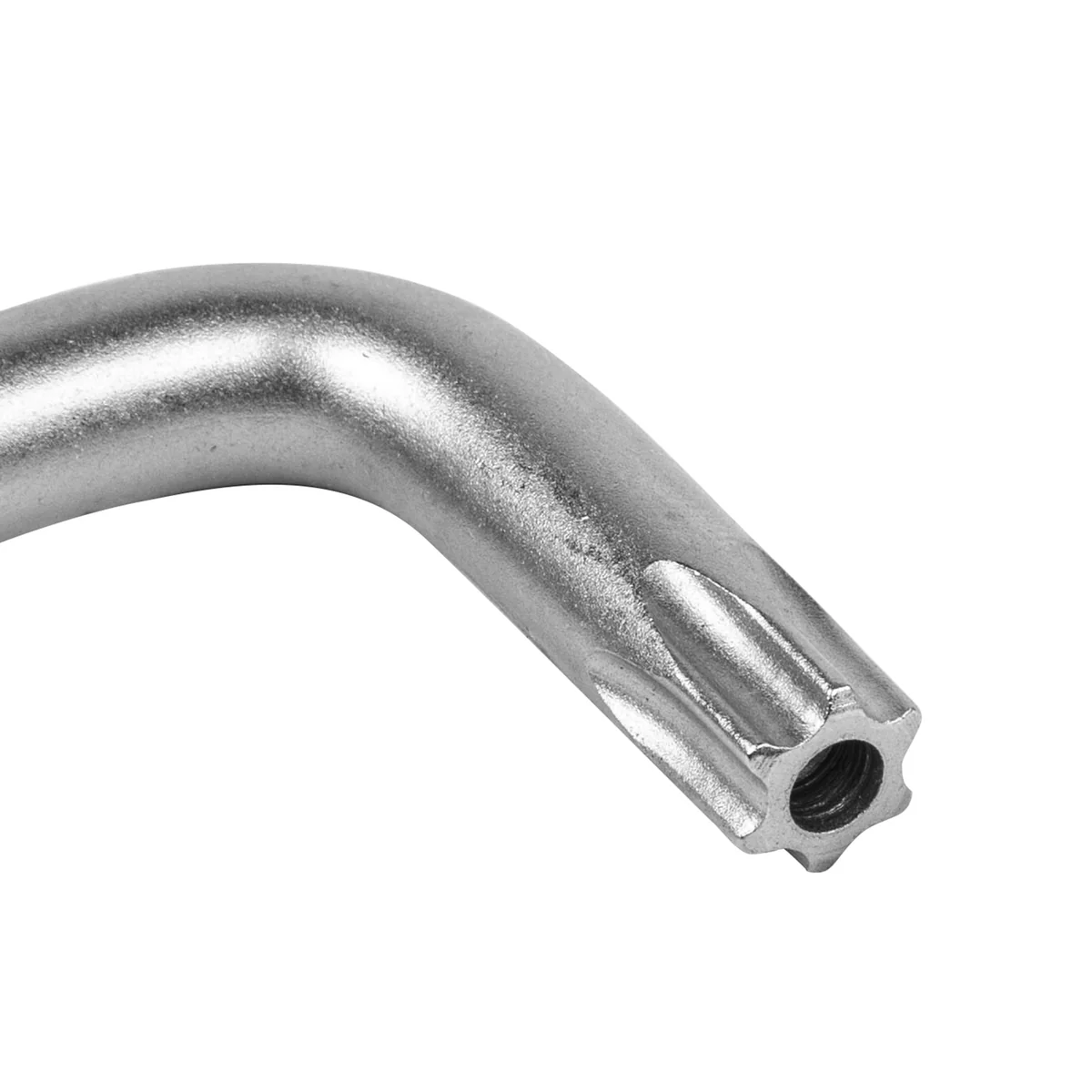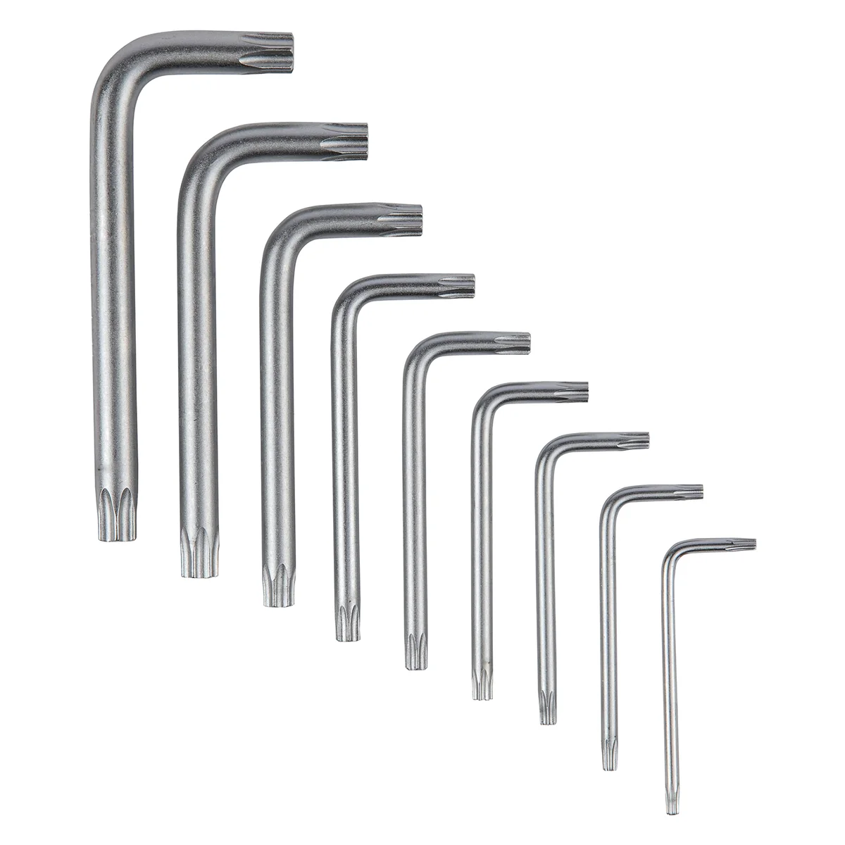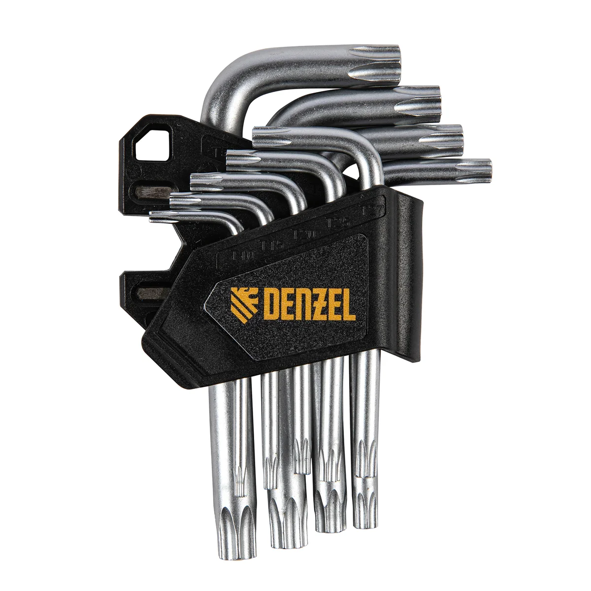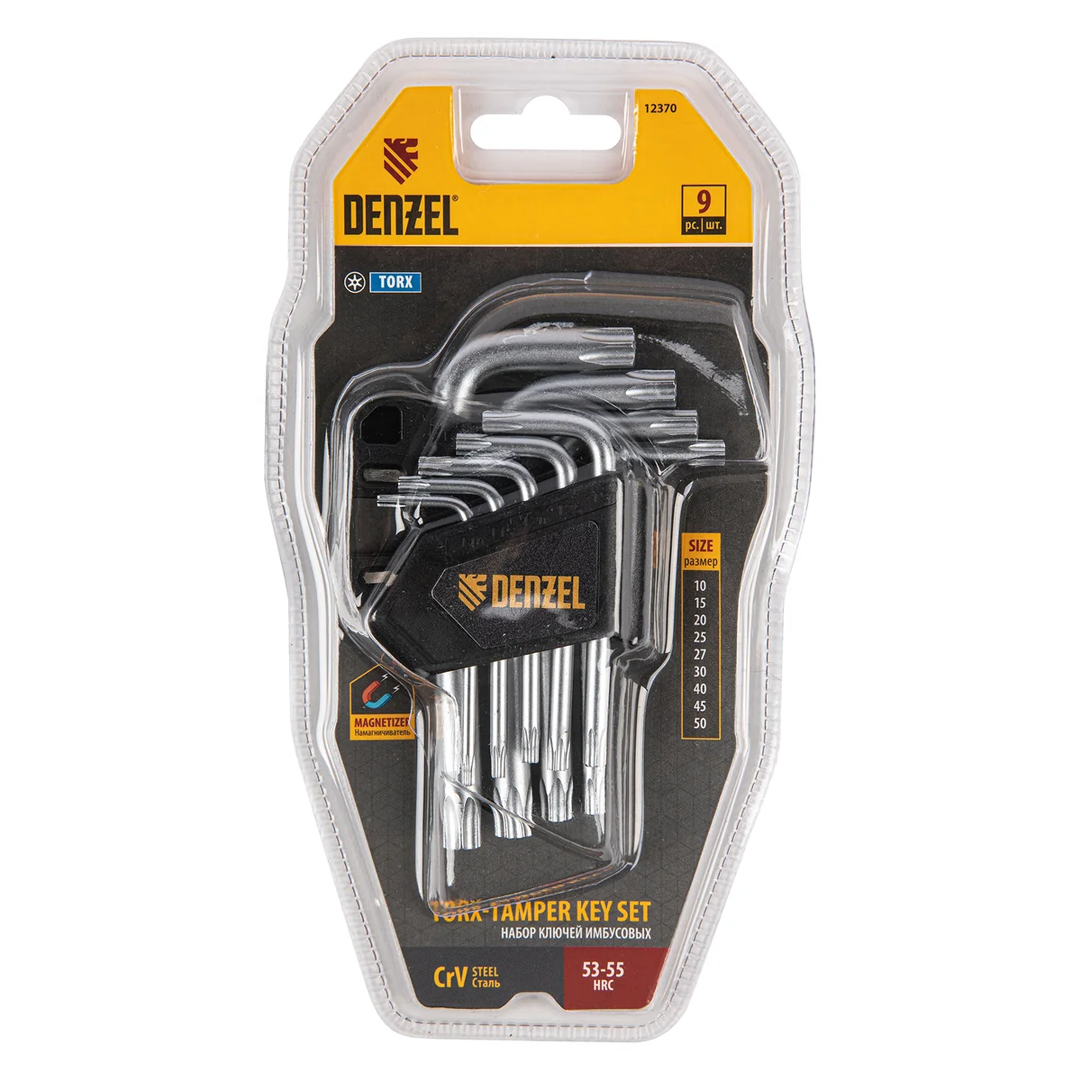 Набор Denzel 12370 включает в себя 9 имбусовых ключей размером TT10-50, из стали CrV, предназначенных для работы с крепежами, имеющими шлицы Torx-Tampered. Инструменты пригодятся для ремонта автомобилей, велосипедов, бытовой техники и электроники.ПреимуществаПрочность — ключи из хромованадиевой стали твердостью 52-55 HRC легко справляются даже с заржавевшими крепежами.Коррозионная стойкость — хромированное покрытие защищает ключи от разрушения.Комфортная работа — благодаря двойному магниту ключи надежно фиксируются в шлице евровинтов.