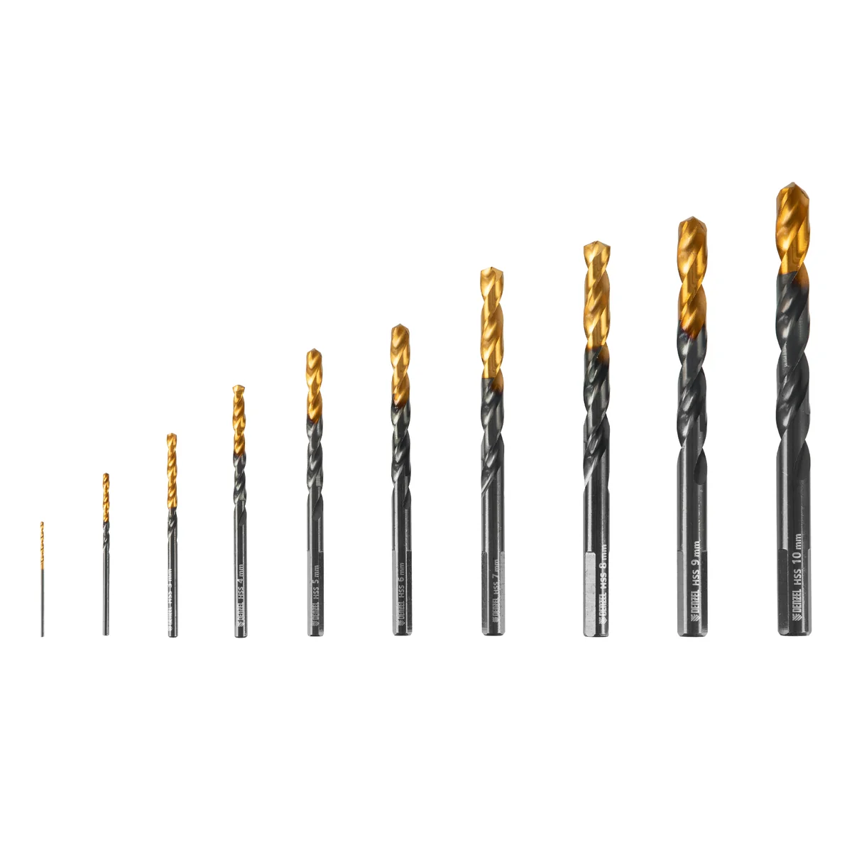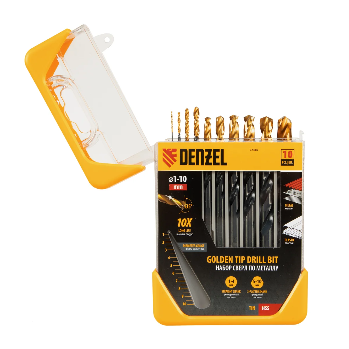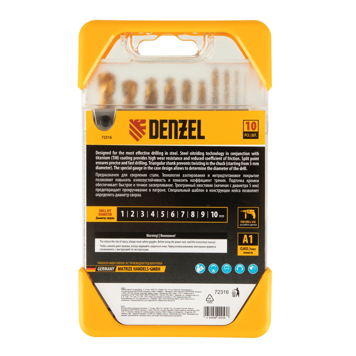 Набор Denzel Golden Tip 72316 включает 10 сверл по металлу из стали HSS-Tin, предназначенных для получения отверстий диаметром 1-10 мм в стальных заготовках. Оснастке присвоен класс точности A1: вышлифованные на высокоточном оборудовании профили имеют оптимальную геометрию, что позволяет получать идеально ровные отверстия. Сверла упакованы в пластиковый кейс, в крышке которого имеется шаблон для быстрого определения диаметра сверла. Набор будет полезен в быту и профессиональной сфере.ПреимуществаПрочность — сверла из быстрорежущей стали устойчивы к перегреву и выдерживают высокие нагрузки.Долговечность — оснастки изготовлены с применением технологии азотирования и имеют нитридтитановое покрытие, что обеспечивает устойчивость к истиранию и образованию коррозии.Высокая скорость сверления — сверла обладают пониженным коэффициентом трения и обеспечивают эффективный отвод стружки.Легкое засверливание — подточка поперечной кромки Split point позволяет приступать к работе без предварительной разметки поверхности (накернивания).Надежная фиксация — сверла с трехгранными хвостовиками не проворачиваются в патроне.Удобное хранение и транспортировка — сверла поставляются в прочном пластиковом кейсе.