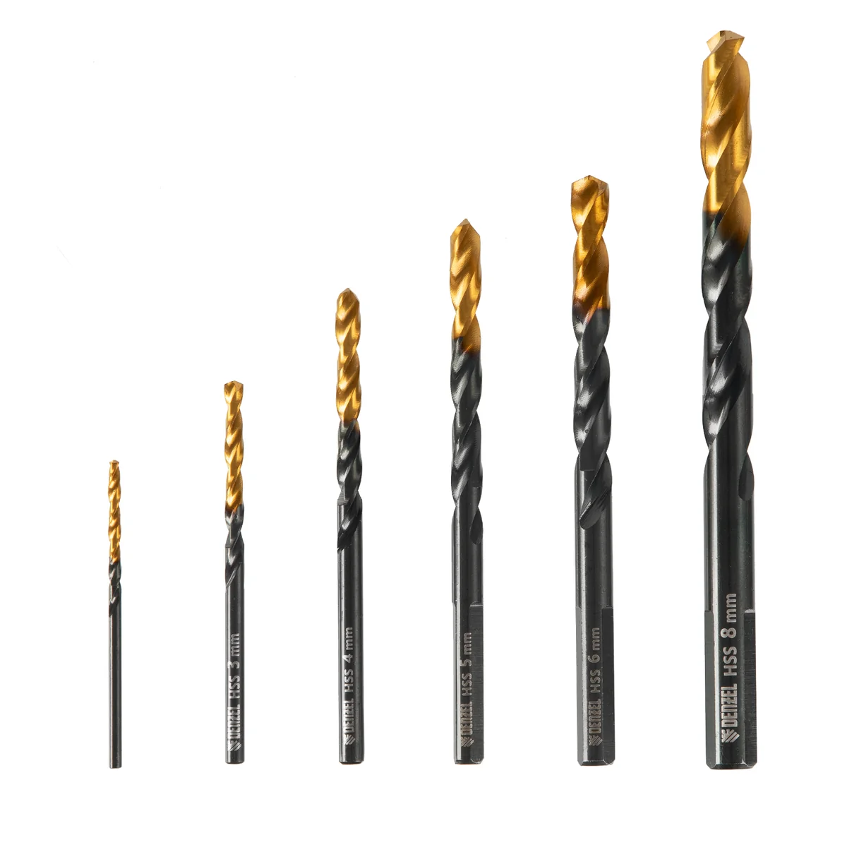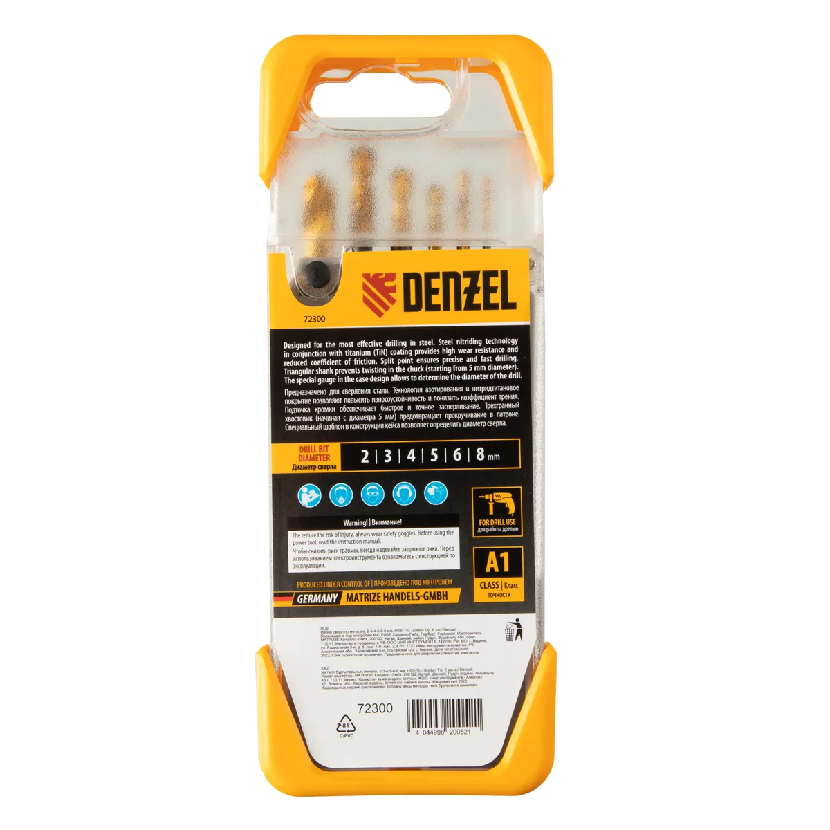 Набор Denzel Golden Tip 72300 включает 6 сверл по металлу диаметром 2, 3, 4, 5, 6 и 8 мм, предназначенных для сверления отверстий в заготовках из сталей различной твердости. Оснастке присвоен класс точности A1: оптимальная геометрия вышлифованных профилей обеспечивает высокую точность полученных отверстий. Сверла упакованы в пластиковый кейс, в крышке которого имеется удобный шаблон для быстрого определения диаметра. Набор будет полезен дома и в слесарной мастерской.ПреимуществаПрочность — сверла из быстрорежущей стали устойчивы к перегреву и выдерживают высокие нагрузки.Долговечность — оснастки изготовлены с применением технологии азотирования и имеют нитридтитановое покрытие, что обеспечивает устойчивость к истиранию и образованию коррозии.Высокая скорость сверления — сверла обладают пониженным коэффициентом трения и обеспечивают эффективный отвод стружки.Легкое засверливание — подточка поперечной кромки Split point позволяет приступать к работе без предварительной разметки поверхности (накернивания).Надежная фиксация — сверла с трехгранными хвостовиками не проворачиваются в патроне.Удобное хранение и транспортировка — сверла поставляются в прочном пластиковом кейсе.