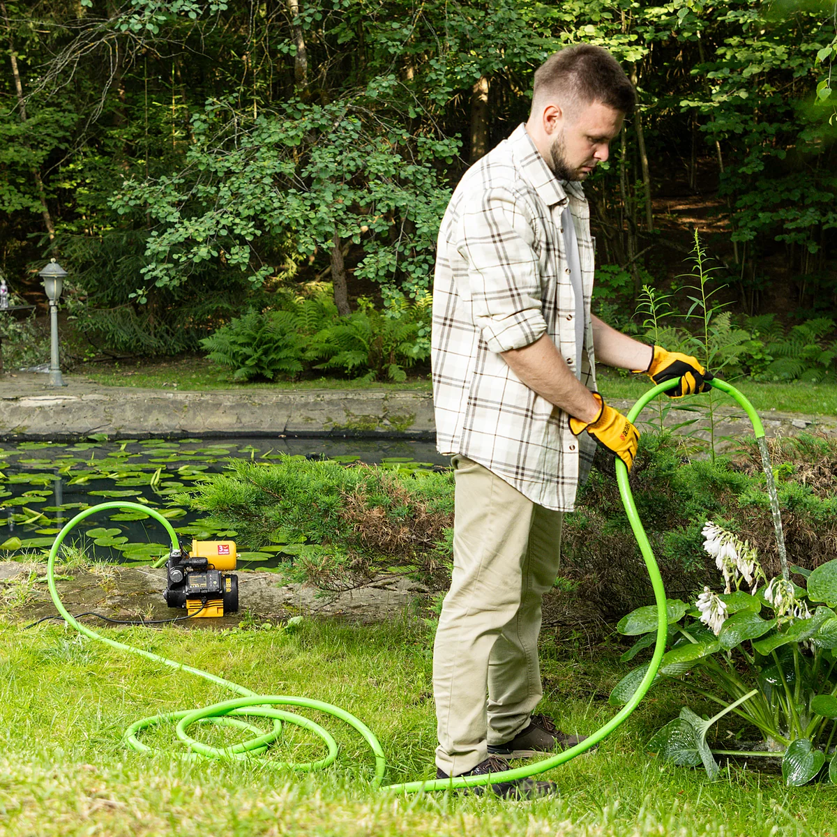 - Автономность — прессостат автоматически останавливает насос при достижении верхнего порогового давления в системе и запускает двигатель, если давление падает.