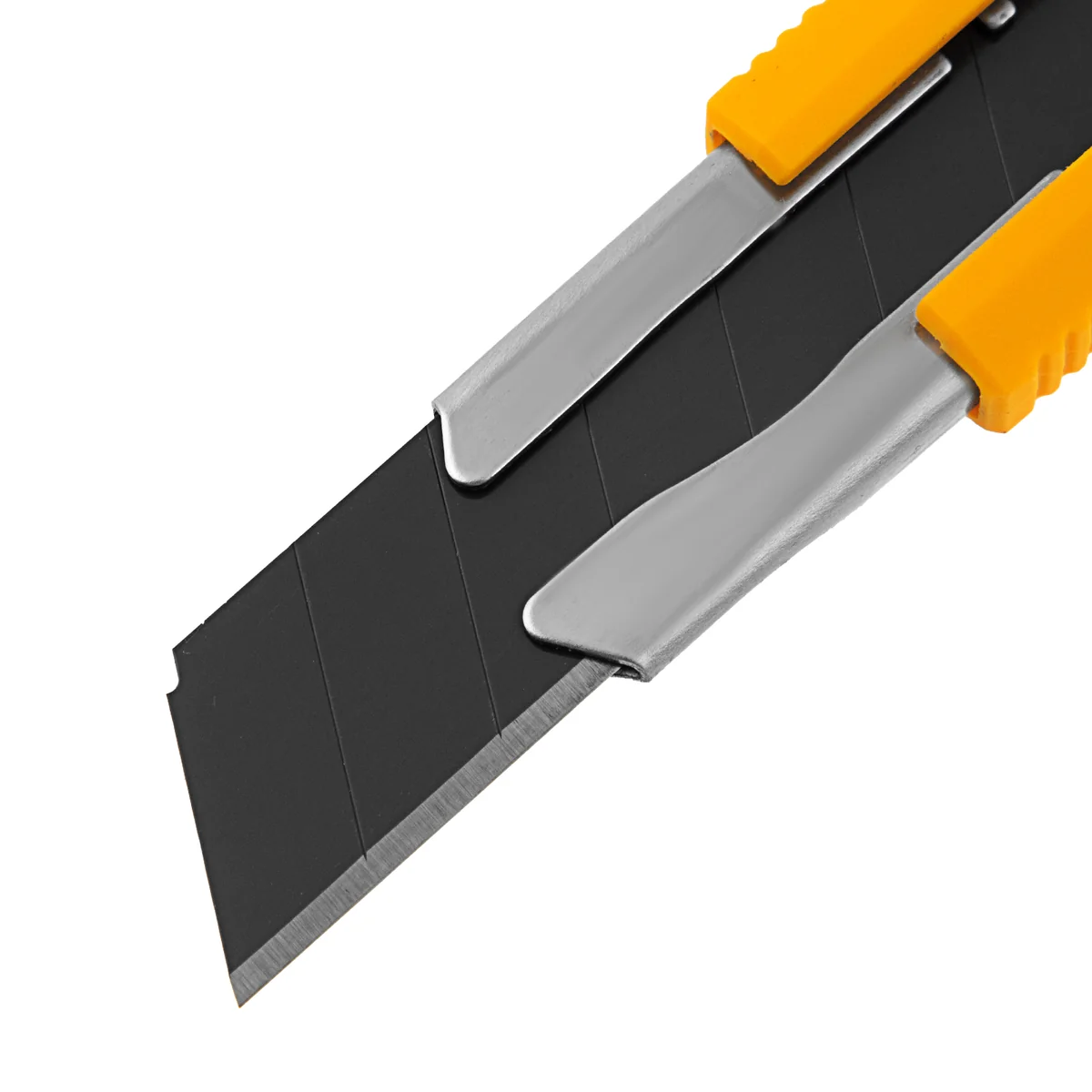 Нож Denzel 78940 с выдвижным лезвием шириной 18 мм предназначен для резки линолеума, ковролина, бумаги, обоев, картона и других листовых материалов.Лезвие ножа изготовлено из высокоуглеродистой инструментальной японской стали SK-4, твердость режущей кромки- 65 HRC. Смена сегмента лезвия производится путем обламывания по линии насечки. Исползуйте шарнирно-губцевый инструмент, направляя нож в безопасную от себя сторону. При обламывании необходимо одевать средства индивидуальной защиты-очки, перчатки.