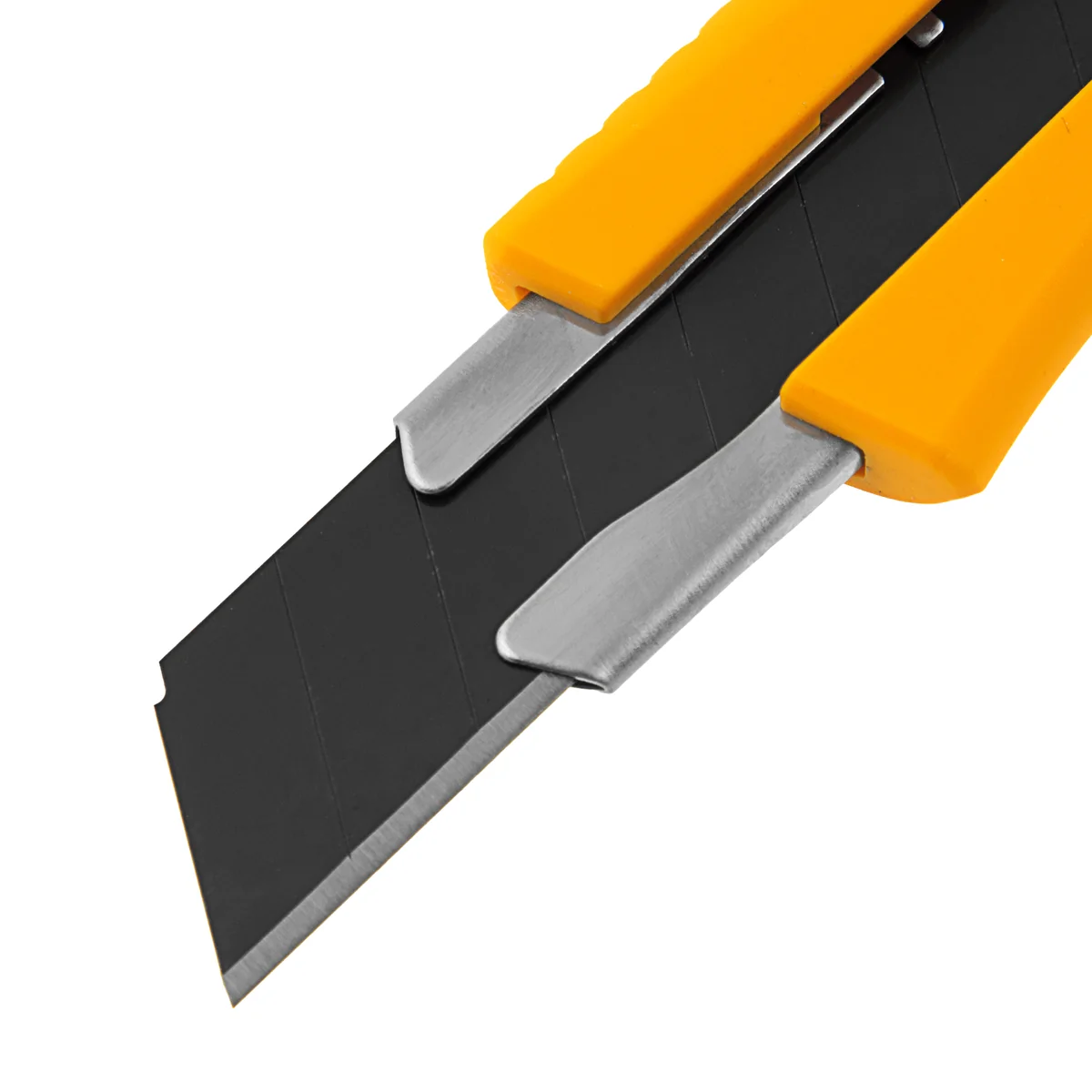 Нож Denzel 78942 с выдвижным лезвием шириной 18 мм предназначен для резки линолеума, ковролина, бумаги, обоев, картона и других листовых материалов. Лезвие ножа изготовлено из высокоуглеродистой инструментальной японской стали SK-4, твердость режущей кромки- 65 HRC. Смена сегмента лезвия производится путем обламывания по линии насечки. Исползуйте шарнирно-губцевый инструмент, направляя нож в безопасную от себя сторону. При обламывании необходимо одевать средства индивидуальной защиты-очки, перчатки.