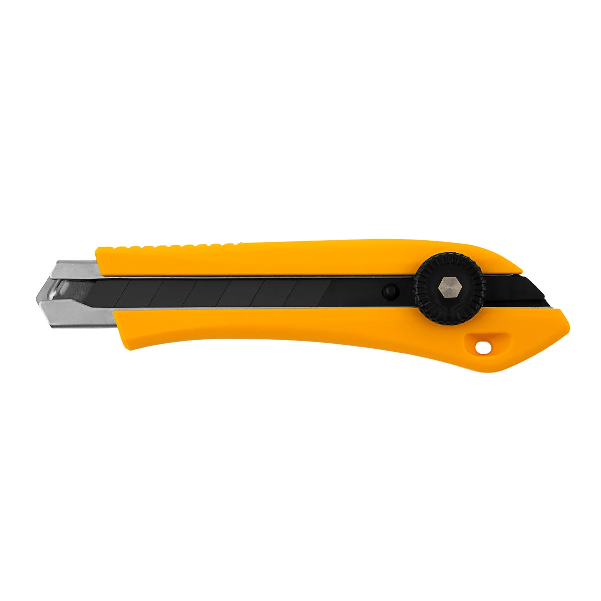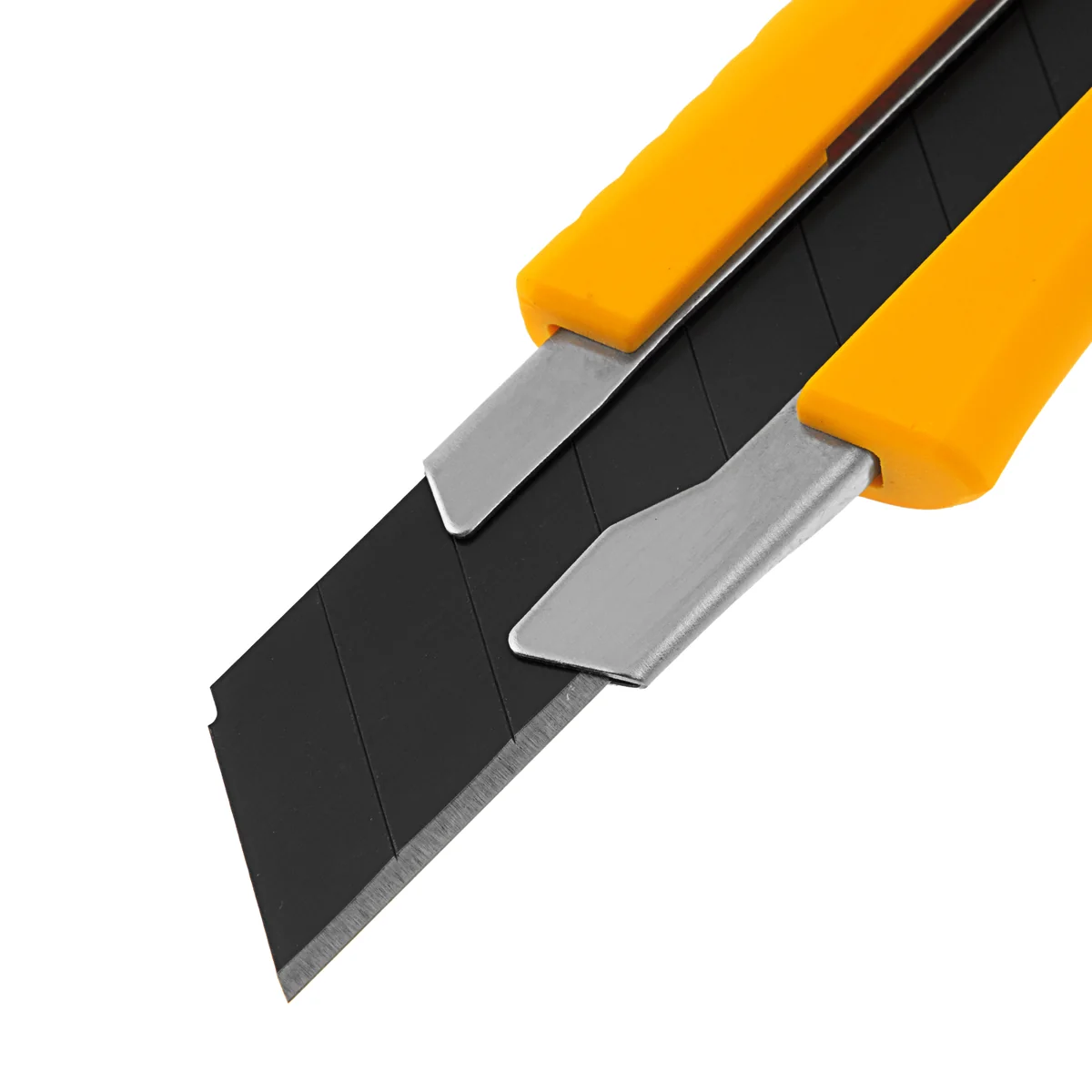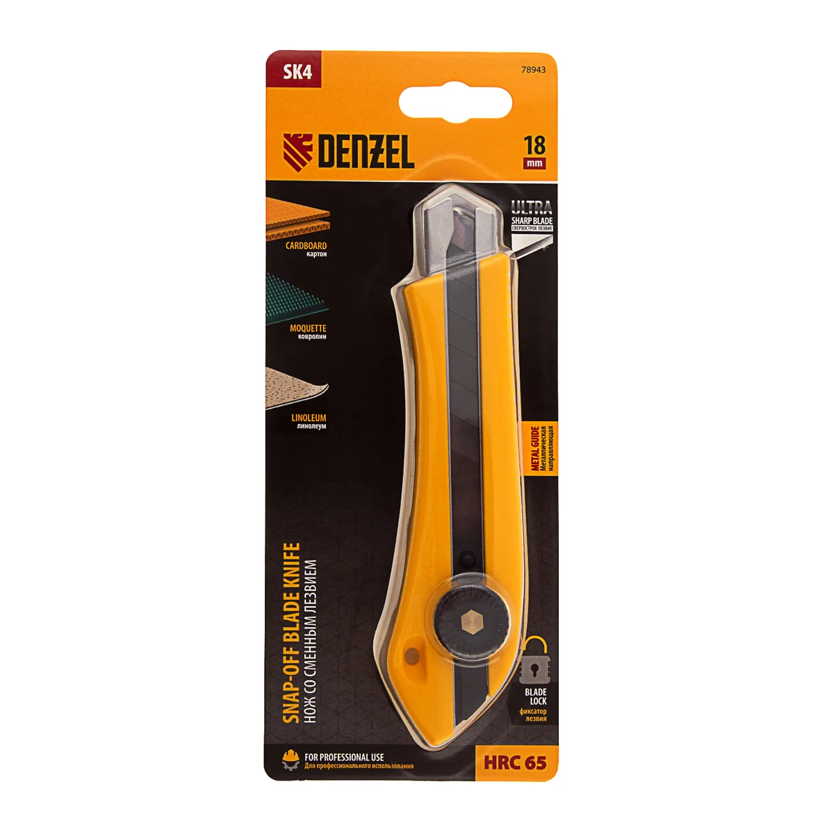 Нож Denzel 78943 с выдвижным лезвием шириной 18 мм предназначен для резки линолеума, ковролина, бумаги, обоев, картона и других листовых материалов. Лезвие ножа изготовлено из высокоуглеродистой инструментальной японской стали SK-4, твердость режущей кромки- 65 HRC. Смена сегмента лезвия производится путем обламывания по линии насечки. Исползуйте шарнирно-губцевый инструмент, направляя нож в безопасную от себя сторону. При обламывании необходимо одевать средства индивидуальной защиты-очки, перчатки.