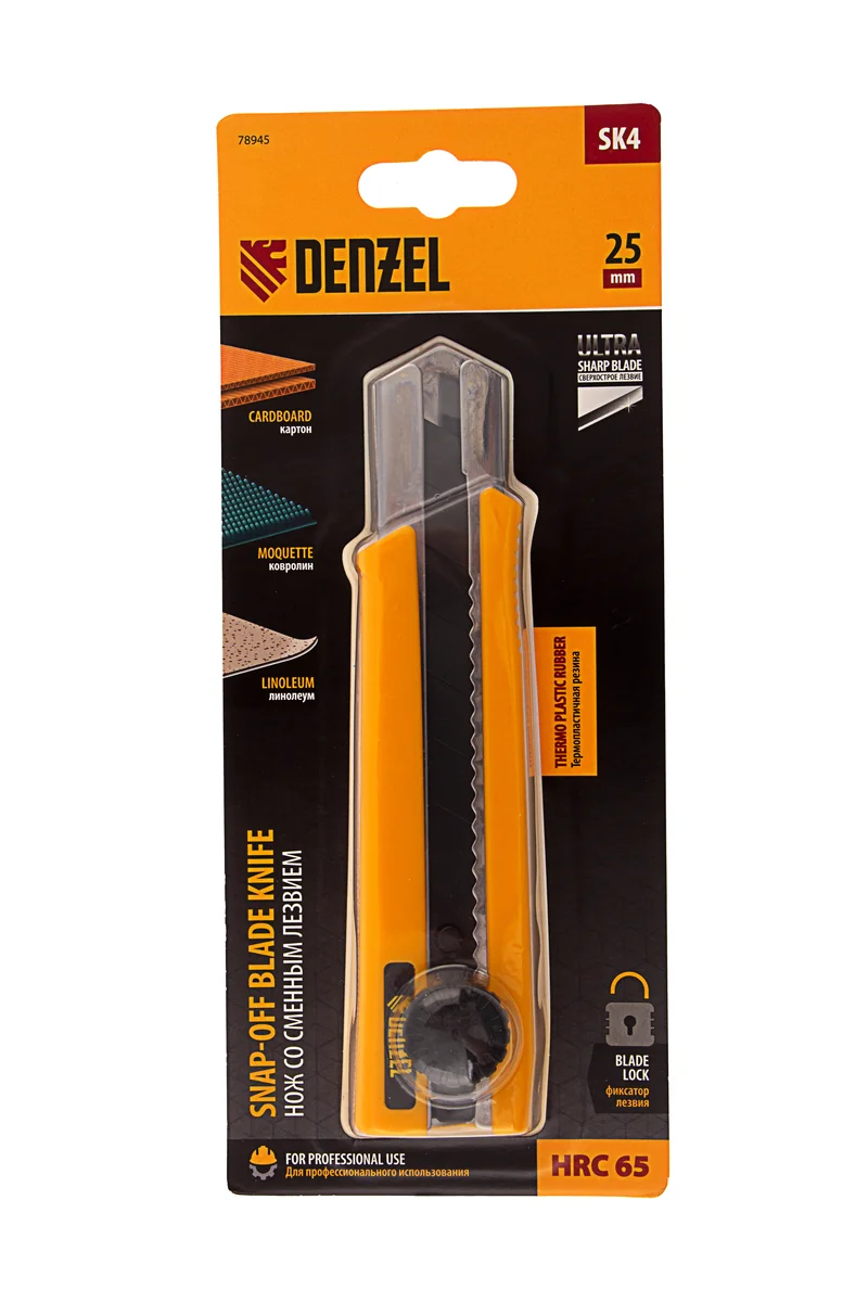 Нож Denzel 78945 с выдвижным лезвием шириной 25 мм предназначен для резки линолеума, ковролина, бумаги, обоев, картона и других листовых материалов.Лезвие ножа изготовлено из высокоуглеродистой инструментальной японской стали SK-4, твердость режущей кромки- 65 HRC. Смена сегмента лезвия производится путем обламывания по линии насечки. Исползуйте шарнирно-губцевый инструмент, направляя нож в безопасную от себя сторону. При обламывании необходимо одевать средства индивидуальной защиты-очки, перчатки.