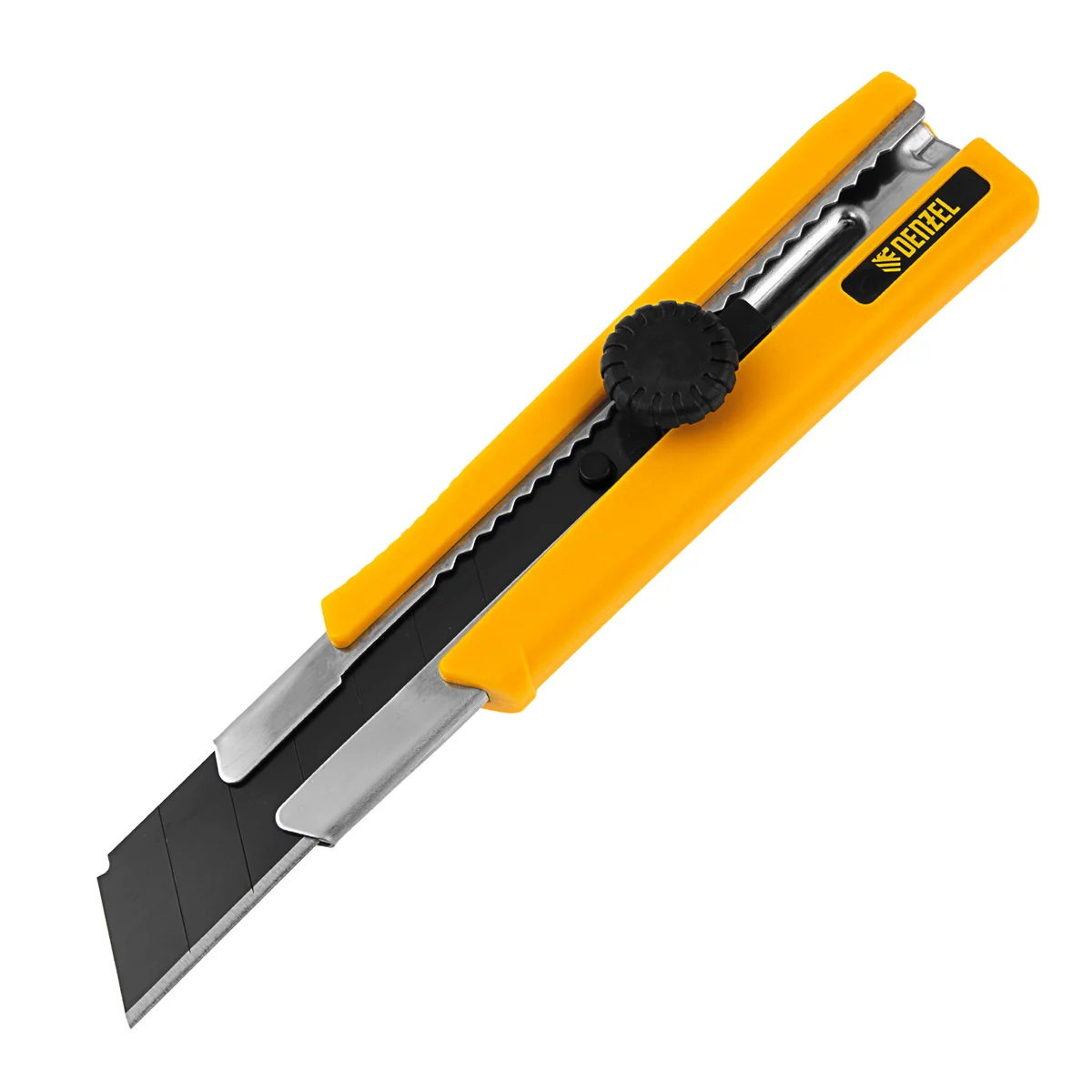 Нож, 25 мм, сменное лезвие, SK4, корпус из TPR, метал. направляющая, винтовой фиксатор// Denzel 78945