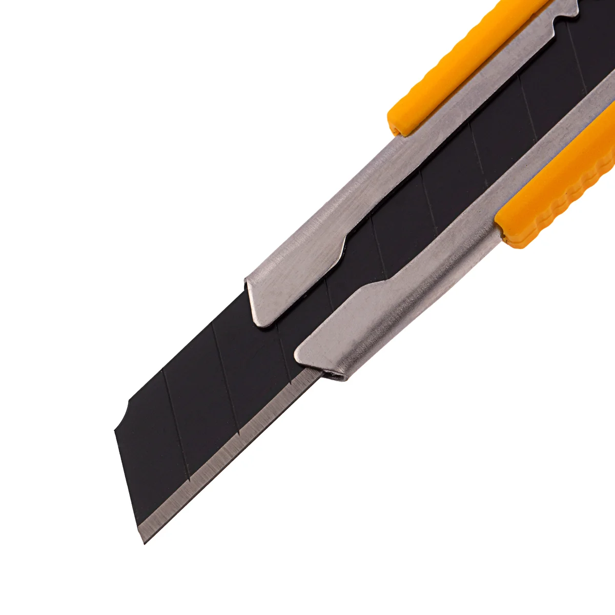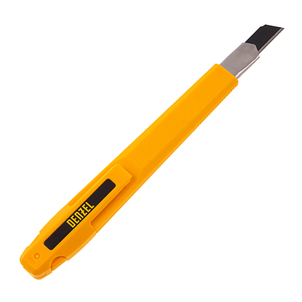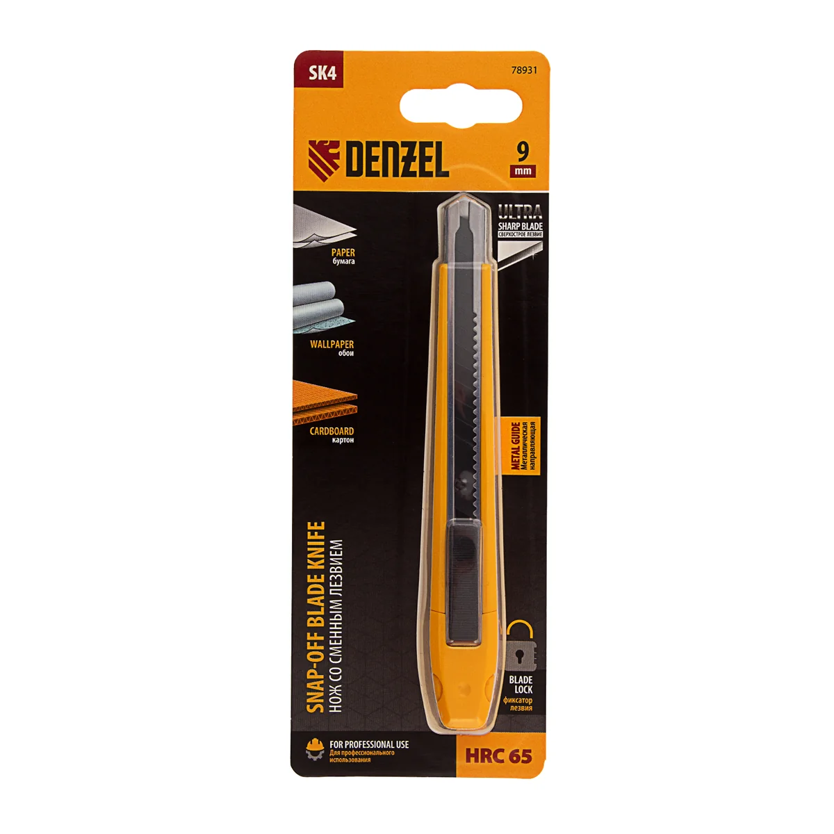 Нож, 9 мм, сменное лезвие, SK4, метал. направляющая, клипса, нажимной фиксатор// Denzel 78931
