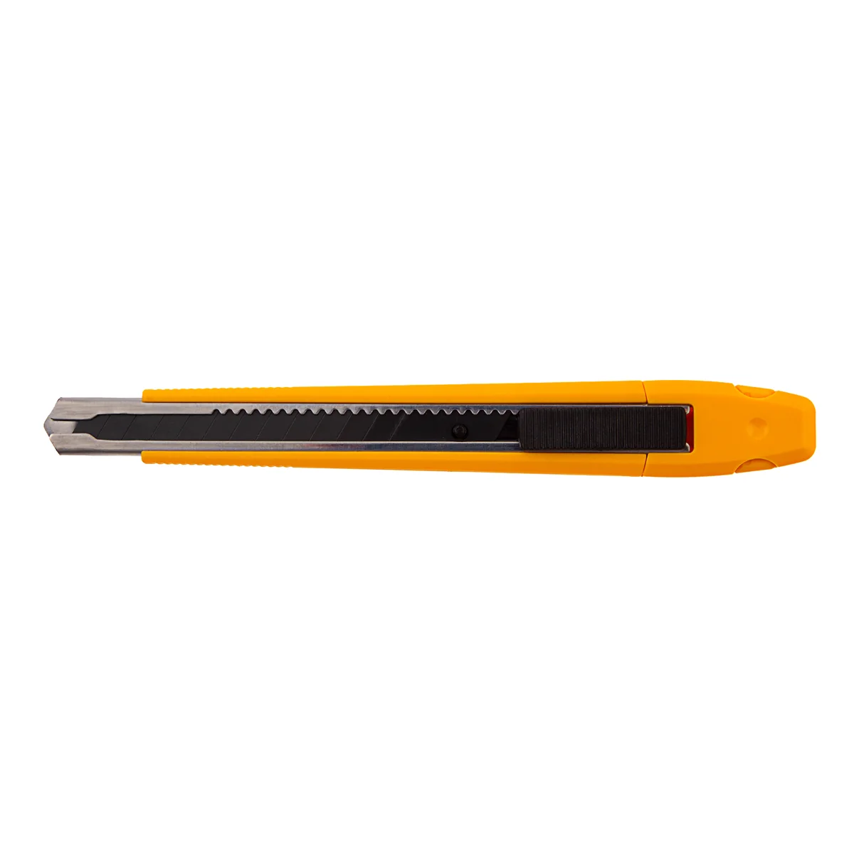 Нож Denzel 78931 с выдвижным лезвием шириной 9 мм предназначен для резки бумаги, обоев, картона и других листовых материалов. Лезвие ножа изготовлено из высокоуглеродистой инструментальной японской стали SK-4, твердость режущей кромки- 65 HRC. Смена сегмента лезвия производится путем обламывания по линии насечки. Исползуйте шарнирно-губцевый инструмент, направляя нож в безопасную от себя сторону. При обламывании необходимо одевать средства индивидуальной защиты-очки, перчатки.