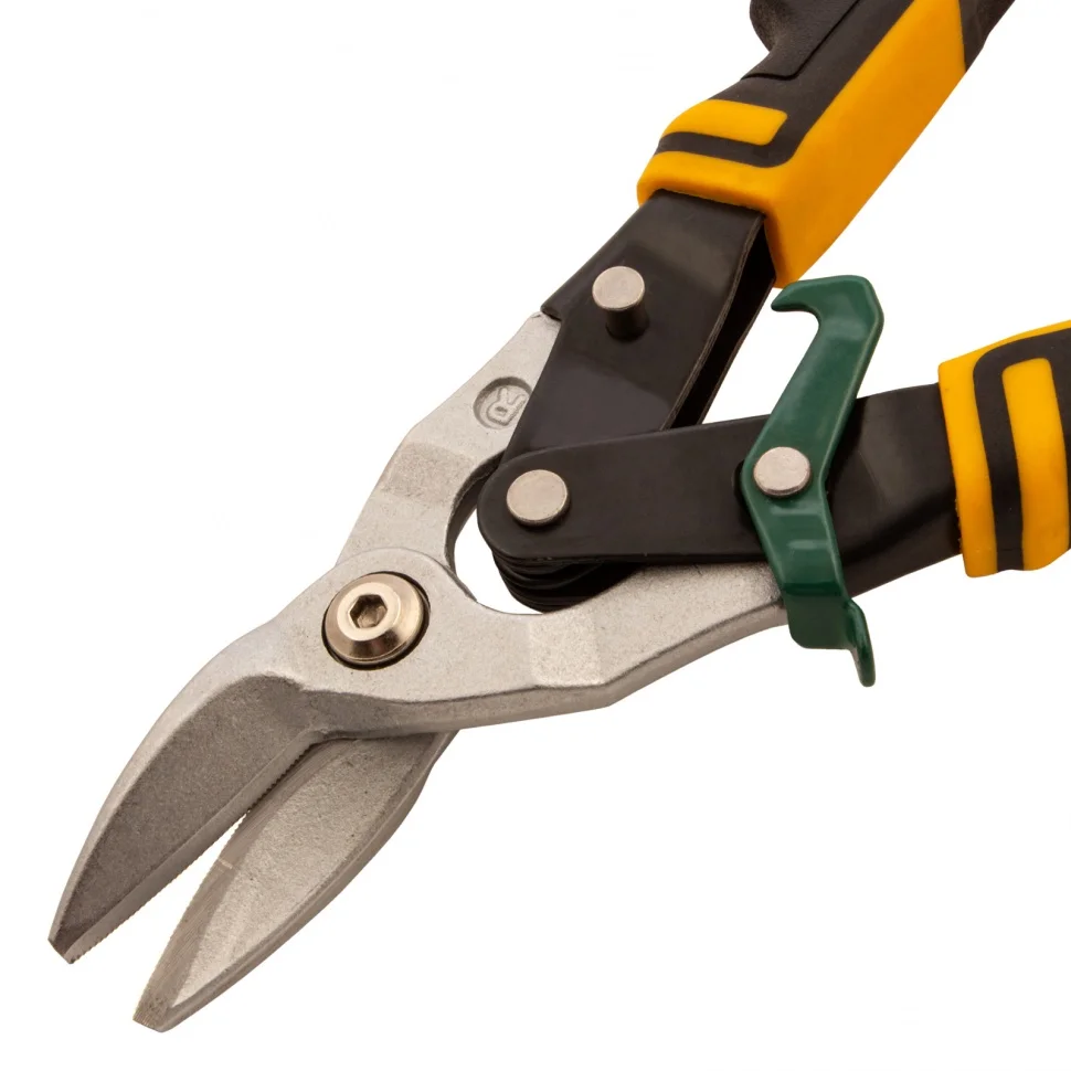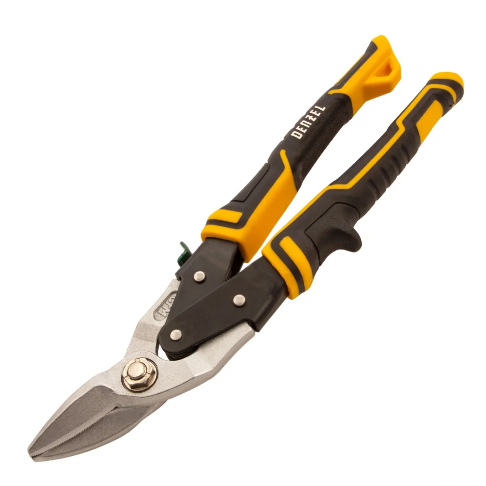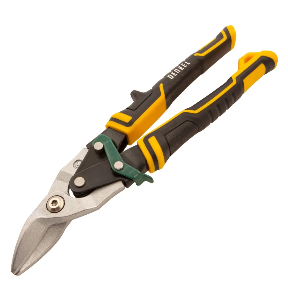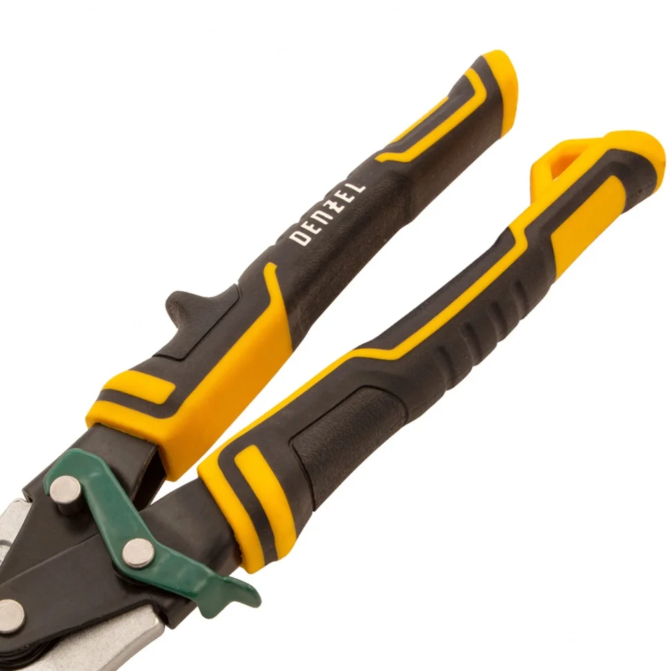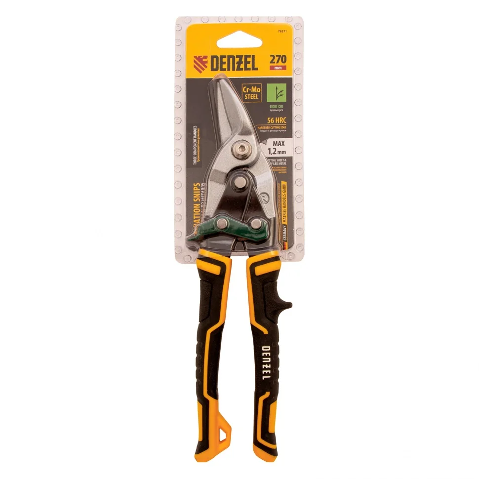 Ножницы по металлу Denzel 78371 общей длиной 270 мм, из стали-CrMo, с трехкомпонентными рукоятками, предназначены для прямого и правого реза листовых металлических заготовок и металлопрофиля толщиной до 1,2 мм. Инструмент отличается усиленной конструкцией осевого шарнира, поэтому рассчитан на профессиональное использование. Незаменим при осуществлении строительных, кровельных и слесарных работ.ПреимуществаЗалогом надежности и прочности ножниц выступает высокое качество исполнения — они выполнены из хромомолибденовой стали методом горячей штамповки.Режущие кромки закалены до твердости 60-62 HRC, поэтому инструмент легко справляется даже с прочной «нержавейкой».Остро заточенные кованые лезвия имеют насечки для предотвращения соскальзывания заготовок.Ножницы оснащены усиленным осевым шарниром, который обеспечивает их долговечность.Блокировочный замок исключает случайное раскрытие лезвий при транспортировке или хранении.Плоский соединительный винт не цепляется за заготовки, что повышает удобство работы.Удлиненные трехкомпонентные рукоятки удобны да и не скользят в руке.На рукоятке имеется специальная петля для компактного хранения ножниц в подвешенном виде.