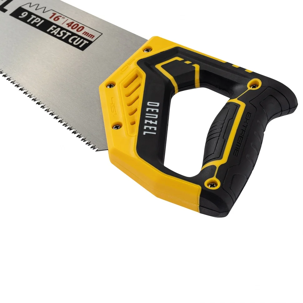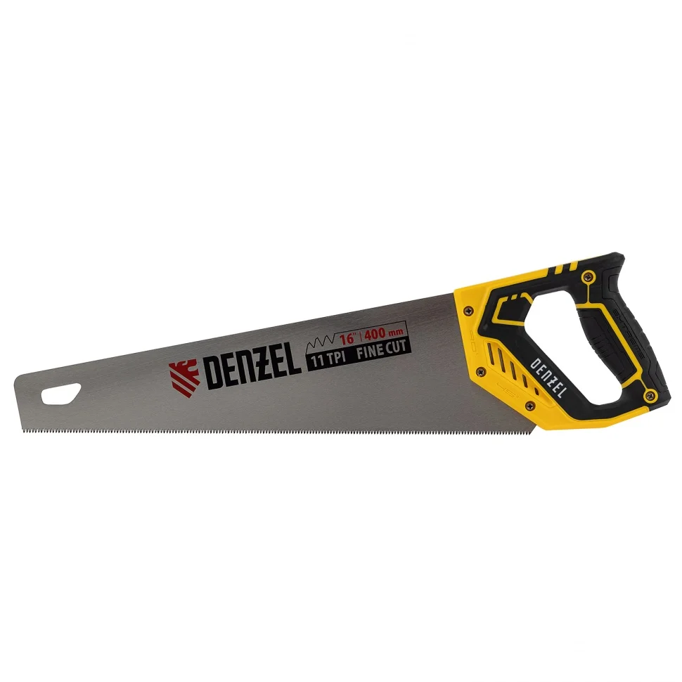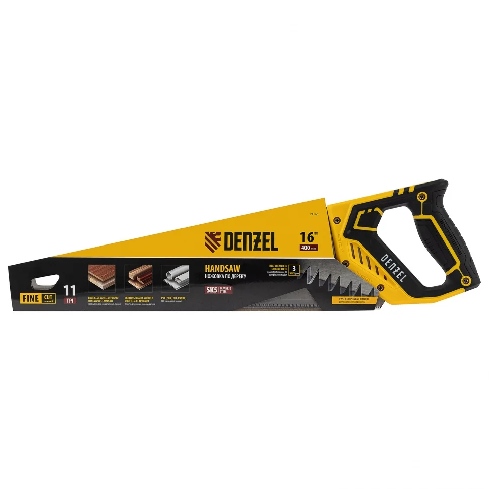 Ножовка по дереву DENZEL предназначена для столярных работ- распиловка заготовок из древесины, ДСП, ДВП, МДФ, ламината, а также из ПВХ (труба, панель, короб). Может производить продольный и поперечный распил. Мелкие зубья с шагом 11 TPI позволяют выполнять более точный и чистый рез. Ножовка обладает высокой производительностью благодаря агрессивной трехгранной, многоступенчатой заточке зубьев, которая обеспечивает идеальную геометрию и высокую остроту зуба.Преимущества:Пильное полотно изготовленное из японской стали SK-5 с шагом зуба 11 TPI, позволяет выполнять более чистый рез.Закалка ТВЧ обеспечивает дополнительную твердость зуба 55-58 HRC.Благодаря эргономичной форме и рифленой поверхности, обрезиненная рукоятка удобно ложится в руку и не скользит, обеспечивая комфорт во время интенсивной работы.