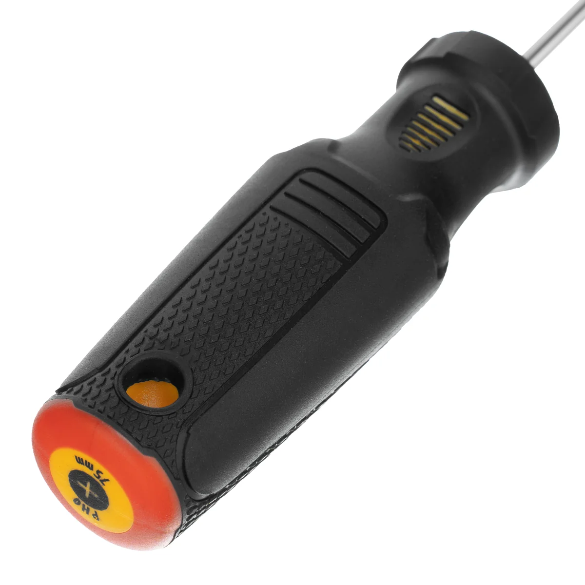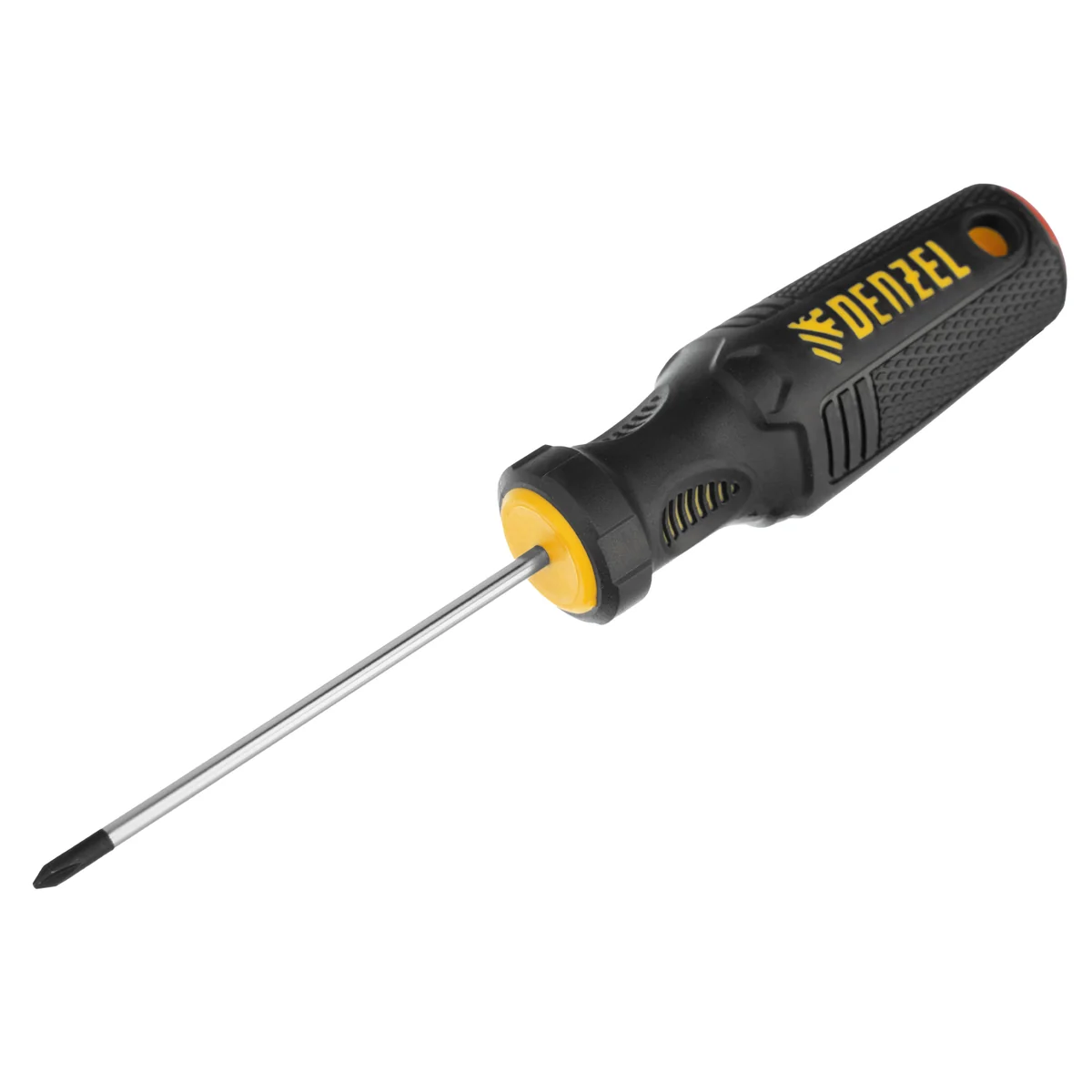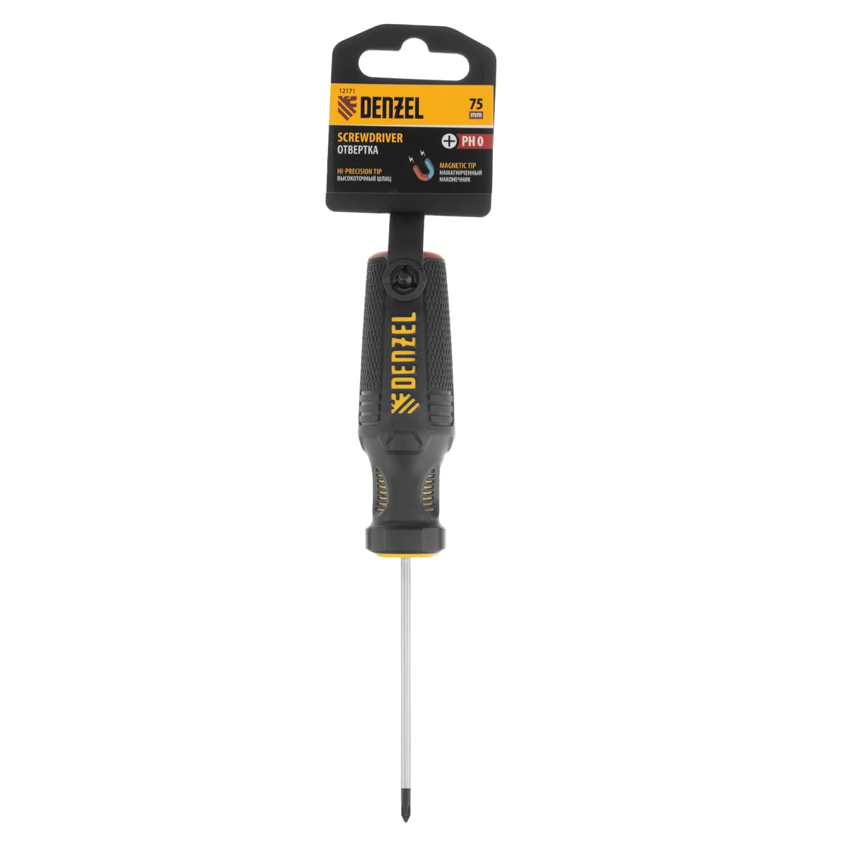 Отвертка PH0 х 75 мм Denzel 12171 из стали CrV, с трехкомпонентной рукояткой, предназначена для закручивания и откручивания резьбовых крепежей типа Philips. Шлиц намагничен, что избавляет от необходимости придерживать винт или саморез рукой. Отвертка рекомендована для профессионального использования.ПреимуществаПрочность — стержень изготовлен из хромованадиевой стали и закален до твердости 51-55 HRC.Износостойкость и защита от коррозии — шлиц фосфатирован, а на стержень нанесено никелевое покрытие.Продуманная маркировка — цветное кольцо на затыльнике соответствует типоразмеру отвертки, что облегчает поиск нужного инструмента.Комфортное использование — эргономичная 3-компонентная рукоятка с резиновыми вставками и подпальцевыми выемками не выскальзывает из ладони и позволяет долго работать без усталости.Удобное хранение — отверстие в рукоятке позволяет подвешивать отвертку на крючок или скобу.