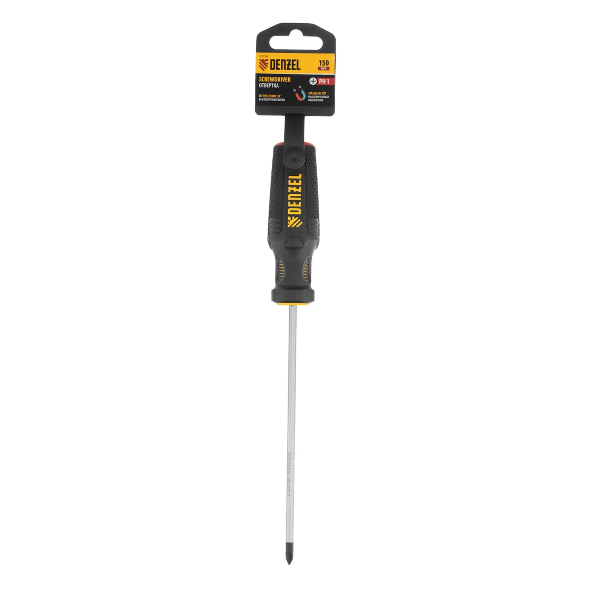Отвертка PH1 х 150 мм Denzel 12176 из стали CrV, с трехкомпонентной рукояткой, предназначена для закручивания и откручивания резьбовых крепежей типа Philips. Шлиц намагничен, что избавляет от необходимости придерживать винт или саморез рукой. Отвертка рекомендована для профессионального использования.ПреимуществаПрочность — стержень изготовлен из хромованадиевой стали и закален до твердости 51-55 HRC.Износостойкость и защита от коррозии — шлиц фосфатирован, а на стержень нанесено никелевое покрытие.Продуманная маркировка — цветное кольцо на затыльнике соответствует типоразмеру отвертки, что облегчает поиск нужного инструмента.Комфортное использование — эргономичная 3-компонентная рукоятка с резиновыми вставками и подпальцевыми выемками не выскальзывает из ладони и позволяет долго работать без усталости.Удобное хранение — отверстие в рукоятке позволяет подвешивать отвертку на крючок или скобу.