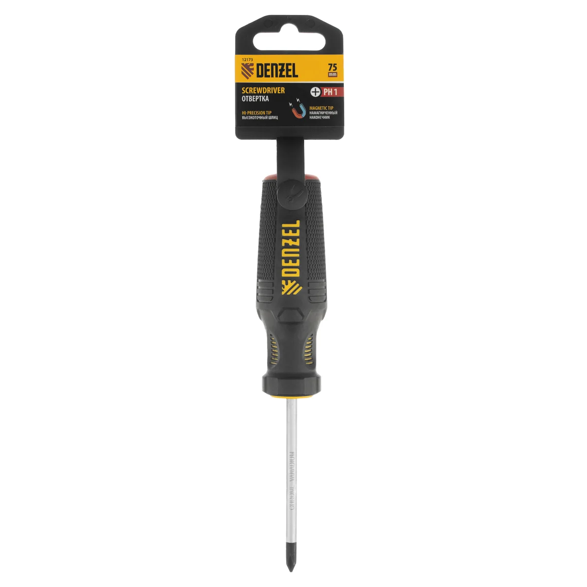 Отвертка PH1 х 75 мм Denzel 12173 из стали CrV, с трехкомпонентной рукояткой, предназначена для закручивания и откручивания резьбовых крепежей типа Philips. Шлиц намагничен, что избавляет от необходимости придерживать винт или саморез рукой. Отвертка рекомендована для профессионального использования.ПреимуществаПрочность — стержень изготовлен из хромованадиевой стали и закален до твердости 51-55 HRC.Износостойкость и защита от коррозии — шлиц фосфатирован, а на стержень нанесено никелевое покрытие.Продуманная маркировка — цветное кольцо на затыльнике соответствует типоразмеру отвертки, что облегчает поиск нужного инструмента.Комфортное использование — эргономичная 3-компонентная рукоятка с резиновыми вставками и подпальцевыми выемками не выскальзывает из ладони и позволяет долго работать без усталости.Удобное хранение — отверстие в рукоятке позволяет подвешивать отвертку на крючок или скобу.