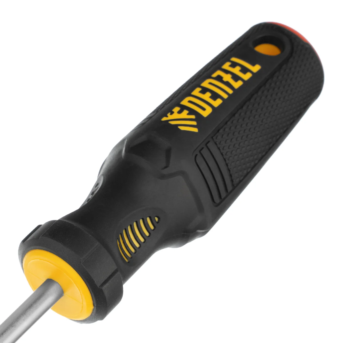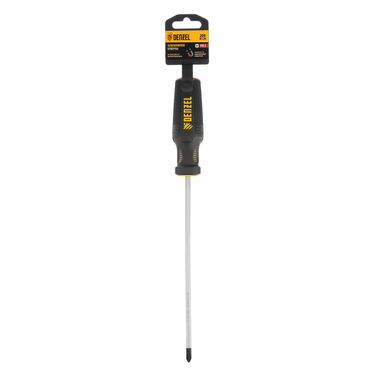 Отвертка PH2 х 200 мм Denzel 12182 из стали CrV, с трехкомпонентной рукояткой, предназначена для закручивания и откручивания резьбовых крепежей типа Philips. Шлиц намагничен, что избавляет от необходимости придерживать винт или саморез рукой. Отвертка рекомендована для профессионального использования.ПреимуществаПрочность — стержень изготовлен из хромованадиевой стали и закален до твердости 51-55 HRC.Износостойкость и защита от коррозии — шлиц фосфатирован, а на стержень нанесено никелевое покрытие.Продуманная маркировка — цветное кольцо на затыльнике соответствует типоразмеру отвертки, что облегчает поиск нужного инструмента.Комфортное использование — эргономичная 3-компонентная рукоятка с резиновыми вставками и подпальцевыми выемками не выскальзывает из ладони и позволяет долго работать без усталости.Удобное хранение — отверстие в рукоятке позволяет подвешивать отвертку на крючок или скобу.