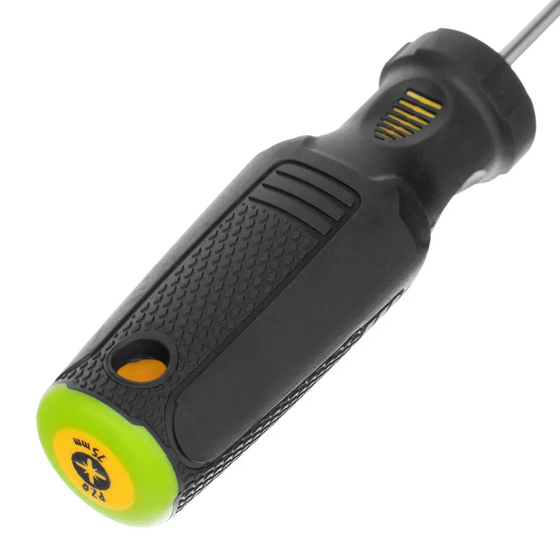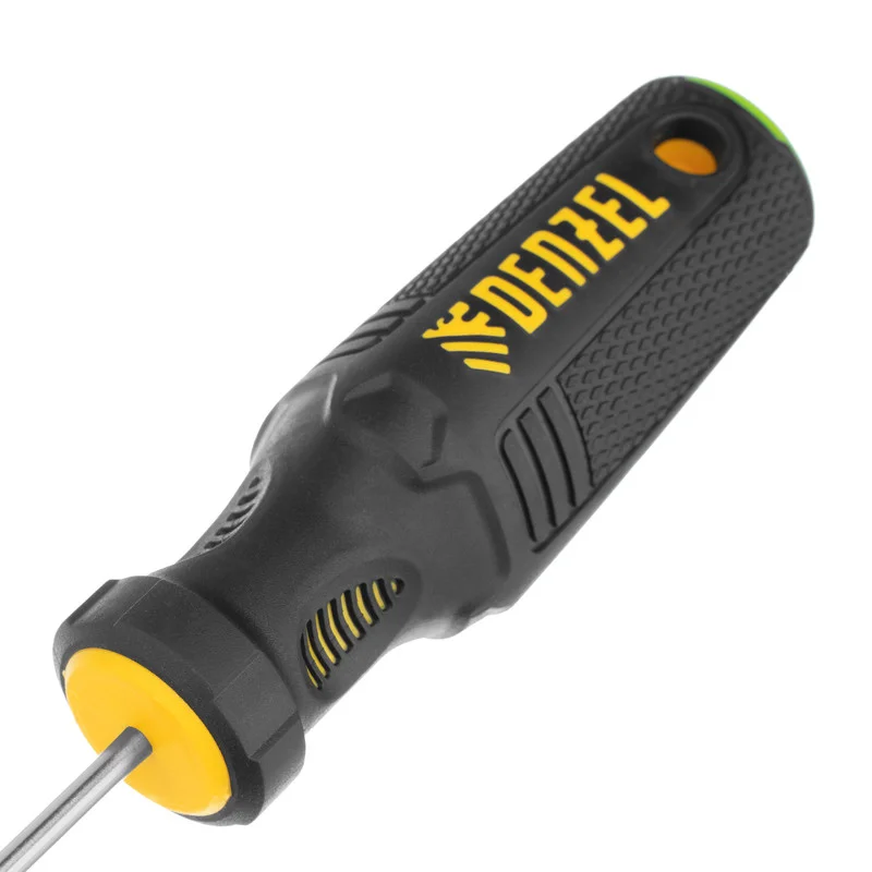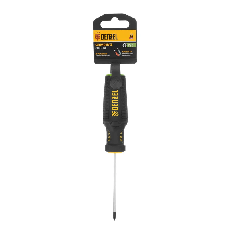 Отвертка PZ0 x 75 мм Denzel 12203 из стали CrV, c трехкомпонентной рукояткой, предназначена для монтажных и демонтажных работ с резьбовыми соединениями типа Pozidriv. Благодаря намагниченному шлицу отвертку с крепежом можно направлять одной рукой, удерживая другой закрепляемую деталь. Инструмент подходит для профессионального использования.ПреимуществаПрочность — стержень изготовлен из хромованадиевой стали и закален до твердости 51-55 HRC.Износостойкость и защита от коррозии — шлиц фосфатирован, а на стержень нанесено никелевое покрытие.Продуманная маркировка — цветное кольцо на затыльнике соответствует типоразмеру отвертки, что облегчает поиск нужного инструмента.Комфортное использование — эргономичная 3-компонентная рукоятка с резиновыми вставками и подпальцевыми выемками не выскальзывает из ладони и позволяет долго работать без усталости.Удобное хранение — отверстие в рукоятке позволяет подвешивать отвертку на крючок или скобу.