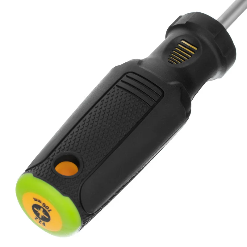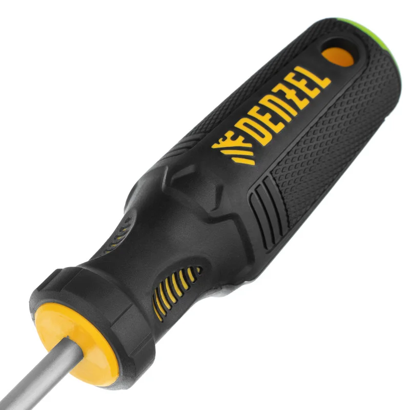 Отвертка PZ2 x 100 мм Denzel 12207 из стали CrV, c трехкомпонентной рукояткой, предназначена для монтажных и демонтажных работ с резьбовыми соединениями типа Pozidriv. Благодаря намагниченному шлицу отвертку с крепежом можно направлять одной рукой, удерживая другой закрепляемую деталь. Инструмент подходит для профессионального использования.ПреимуществаПрочность — стержень изготовлен из хромованадиевой стали и закален до твердости 51-55 HRC.Износостойкость и защита от коррозии — шлиц фосфатирован, а на стержень нанесено никелевое покрытие.Продуманная маркировка — цветное кольцо на затыльнике соответствует типоразмеру отвертки, что облегчает поиск нужного инструмента.Комфортное использование — эргономичная 3-компонентная рукоятка с резиновыми вставками и подпальцевыми выемками не выскальзывает из ладони и позволяет долго работать без усталости.Удобное хранение — отверстие в рукоятке позволяет подвешивать отвертку на крючок или скобу.