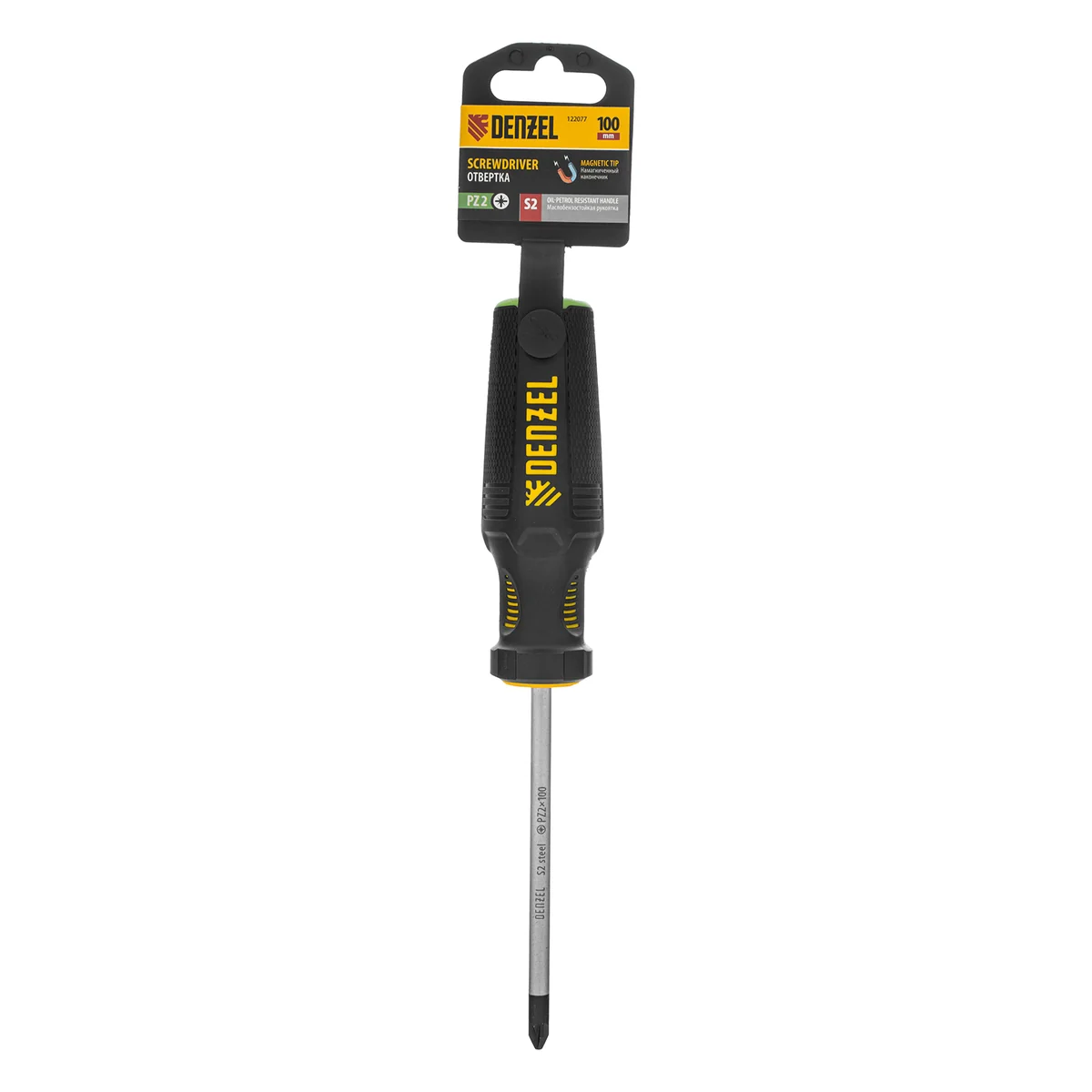 Отвертка Denzel 122077 с трехкомпонентной рукояткой, со стержнем из стали S2, длиной 100 мм, имеет шлиц PZ2 и предназначена для монтажных и демонтажных работ с резьбовыми соединениями типа Pozidriv. Благодаря намагниченному высокоточному шлицу отвертку с крепежом можно направлять одной рукой, удерживая другой закрепляемую деталь. Инструмент подходит для профессионального использования.