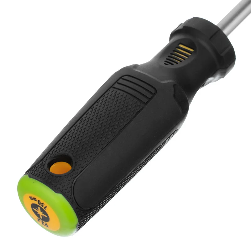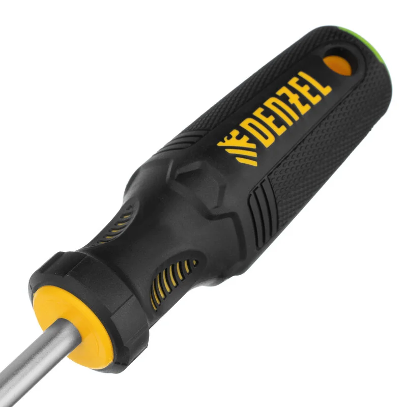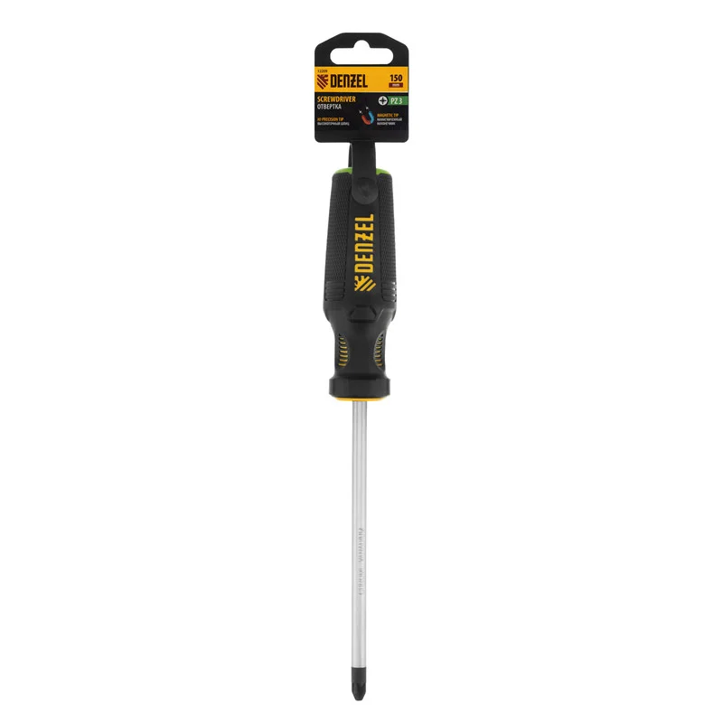 Отвертка PZ3 x 150 мм Denzel 12209 из стали CrV, c трехкомпонентной рукояткой, предназначена для монтажных и демонтажных работ с резьбовыми соединениями типа Pozidriv. Благодаря намагниченному шлицу отвертку с крепежом можно направлять одной рукой, удерживая другой закрепляемую деталь. Инструмент подходит для профессионального использования.ПреимуществаПрочность — стержень изготовлен из хромованадиевой стали и закален до твердости 51-55 HRC.Износостойкость и защита от коррозии — шлиц фосфатирован, а на стержень нанесено никелевое покрытие.Продуманная маркировка — цветное кольцо на затыльнике соответствует типоразмеру отвертки, что облегчает поиск нужного инструмента.Комфортное использование — эргономичная 3-компонентная рукоятка с резиновыми вставками и подпальцевыми выемками не выскальзывает из ладони и позволяет долго работать без усталости.Удобное хранение — отверстие в рукоятке позволяет подвешивать отвертку на крючок или скобу.