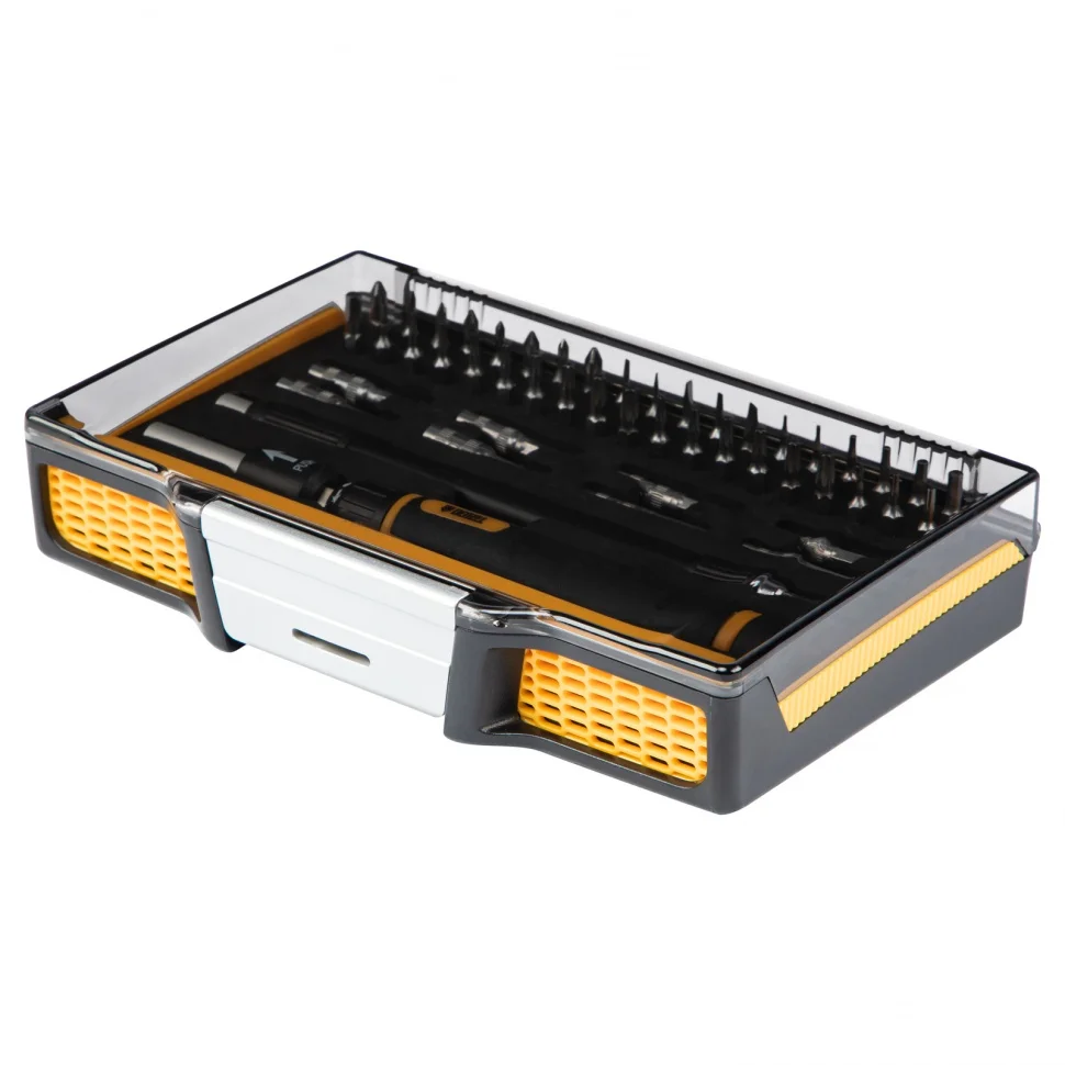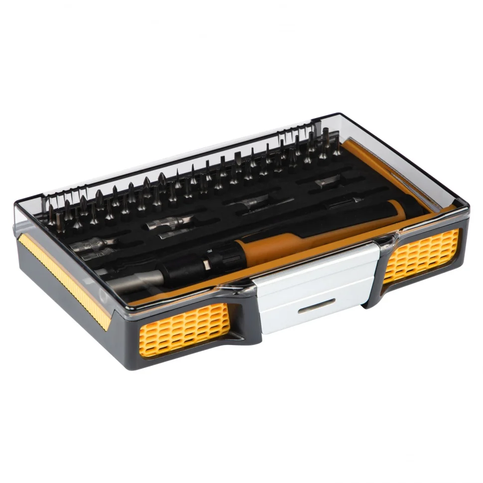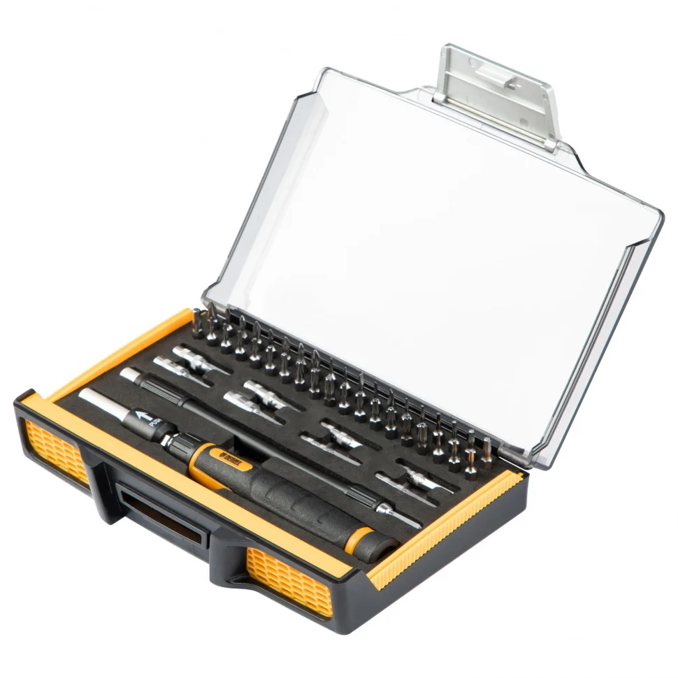 Отвертка с набором бит и торцевых головок Gross 11599, с гибким приводом, 48 предметов из стали CrMo, рассчитана на осуществление точных работ. С ее помощью можно отремонтировать очки, игрушки, портативную и бытовую технику и т.д. К отвертке прилагаются выдвижной стержень и гибкий удлинитель, позволяющие работать с мелкими деталями в углублениях и труднодоступных местах.ПреимуществаНасадки изготовлены из стали CrMo и закалены до твердости 54-56 HRC, что обеспечивает их износостойкость и долговечность.Реверсивный механизм значительно повышает скорость работы.Вращающийся затыльник обеспечивает более удобную работу с микровинтами.Намагниченные биты позволяют легко доставать металлический крепеж из углублений и насаживать его одной рукой.Отверткой комфортно работать за счет эргономичной двухкомпонентной рукоятки.Пластиковый жесткий кейс с защелкой позволяет с удобством транспортировать и безопасно хранить набор.