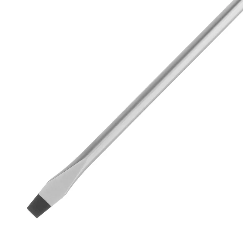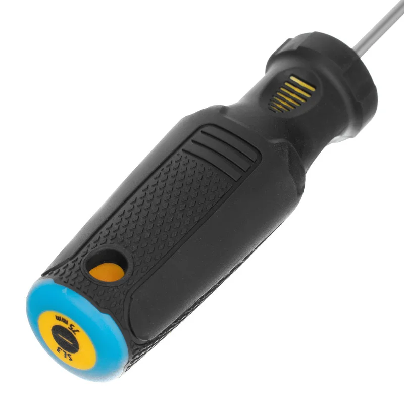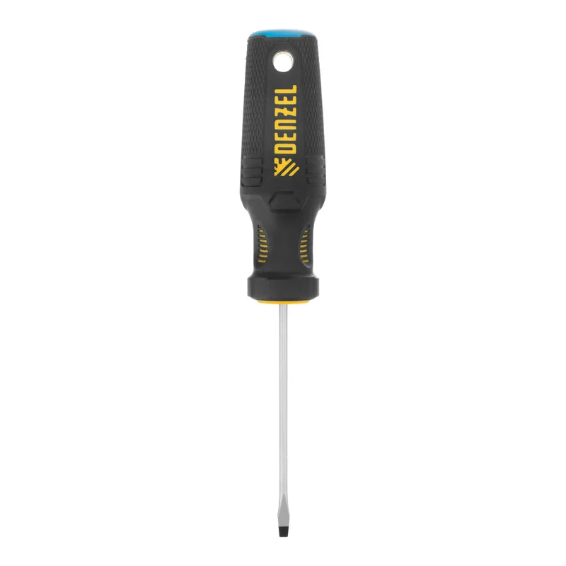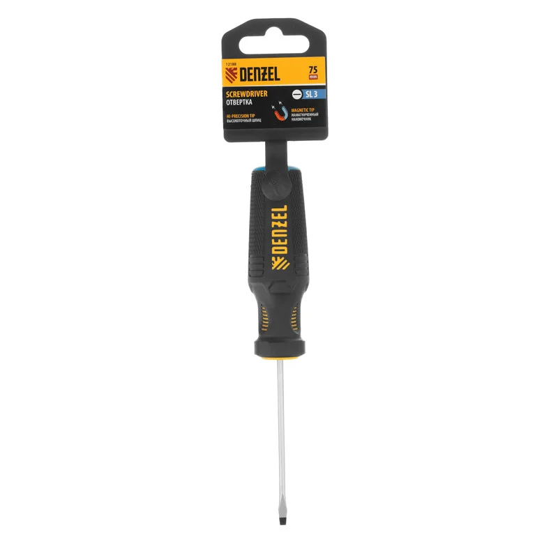Отвертка SL3 х 75 мм Denzel 12188 из стали CrV, с трехкомпонентной рукояткой, используется для монтажа и демонтажа винтов и саморезов с прямым шлицем Slotted. Намагниченный шлиц крепко фиксируется в головке крепежа. Отвертка выдерживает интенсивное применение и предназначена для выполнения профессиональных ремонтных и монтажных работ.ПреимуществаПрочность — стержень изготовлен из хромованадиевой стали и закален до твердости 51-55 HRC.Износостойкость и защита от коррозии — шлиц фосфатирован, а на стержень нанесено никелевое покрытие.Продуманная маркировка — цветное кольцо на затыльнике соответствует типоразмеру отвертки, что облегчает поиск нужного инструмента.Комфортное использование — эргономичная 3-компонентная рукоятка с резиновыми вставками и подпальцевыми выемками не выскальзывает из ладони и позволяет долго работать без усталости.Удобное хранение — отверстие в рукоятке позволяет подвешивать отвертку на крючок или скобу.
