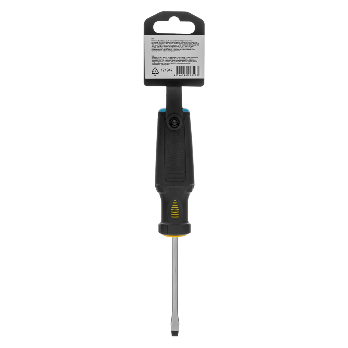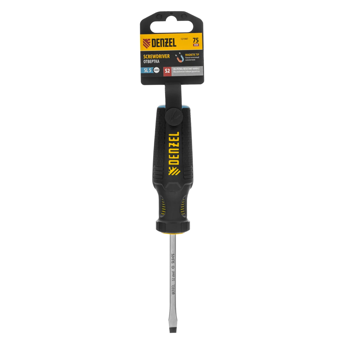 Отвертка Denzel 121947 с трехкомпонентной рукояткой, со стержнем из стали S5, длиной 75 мм, предназначена для монтажа и демонтажа винтов и саморезов с прямым шлицем SL5. Высокоточный намагниченный шлиц крепко фиксируется в головке крепежа. Отвертка выдерживает интенсивное применение, предназначена для выполнения профессиональных ремонтных и монтажных работ.