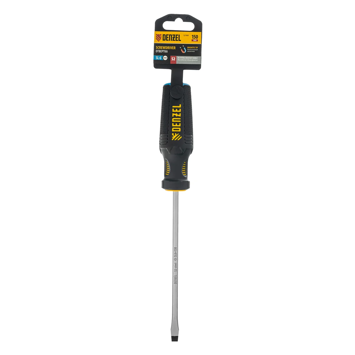 Отвертка Denzel 121997 с трехкомпонентной рукояткой, со стержнем из стали S2, длиной 150 мм, предназначена для монтажа и демонтажа винтов и саморезов с прямым шлицем SL6. Высокоточный намагниченный шлиц крепко фиксируется в головке крепежа. Отвертка выдерживает интенсивное применение, предназначена для выполнения профессиональных ремонтных и монтажных работ.
