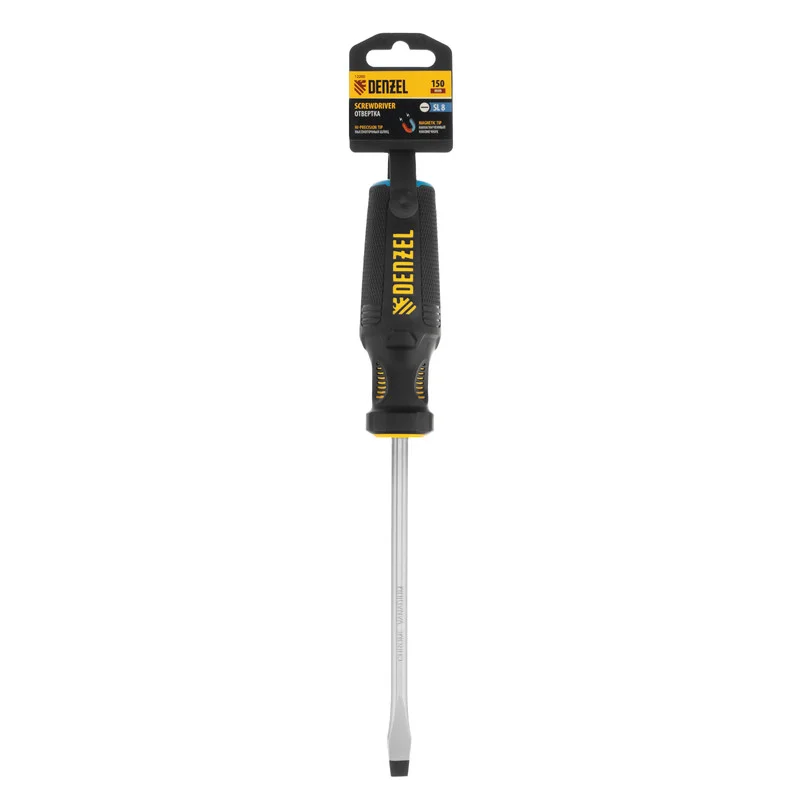 Отвертка SL8 х 150 мм Denzel 12200 из стали CrV, с трехкомпонентной рукояткой, используется для монтажа и демонтажа винтов и саморезов с прямым шлицем Slotted. Намагниченный шлиц крепко фиксируется в головке крепежа. Отвертка выдерживает интенсивное применение и предназначена для выполнения профессиональных ремонтных и монтажных работ.ПреимуществаПрочность — стержень изготовлен из хромованадиевой стали и закален до твердости 51-55 HRC.Износостойкость и защита от коррозии — шлиц фосфатирован, а на стержень нанесено никелевое покрытие.Продуманная маркировка — цветное кольцо на затыльнике соответствует типоразмеру отвертки, что облегчает поиск нужного инструмента.Комфортное использование — эргономичная 3-компонентная рукоятка с резиновыми вставками и подпальцевыми выемками не выскальзывает из ладони и позволяет долго работать без усталости.Удобное хранение — отверстие в рукоятке позволяет подвешивать отвертку на крючок или скобу.