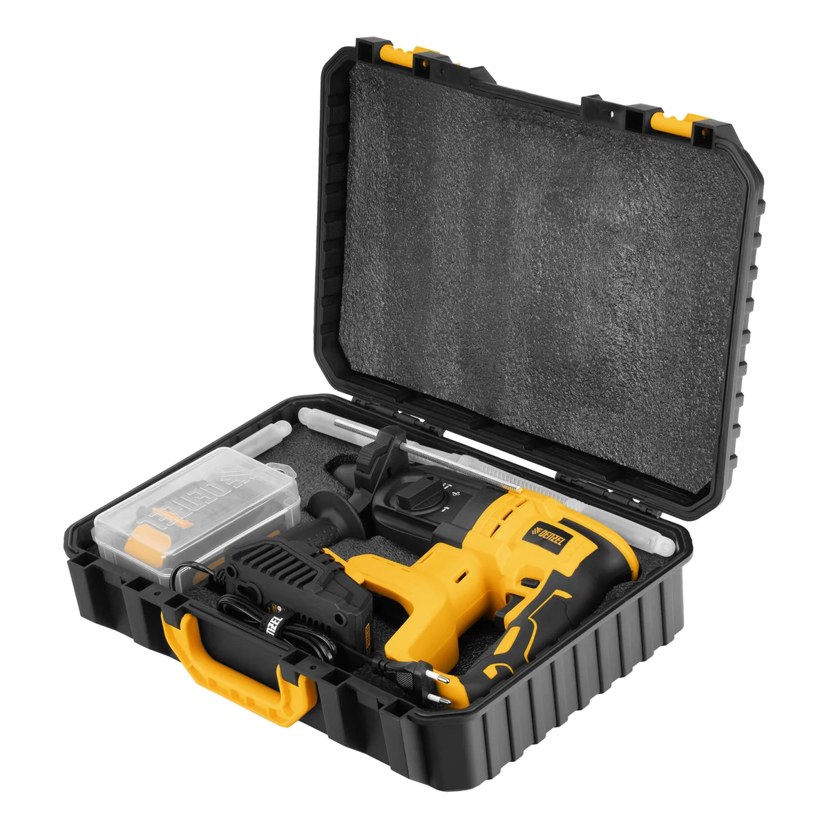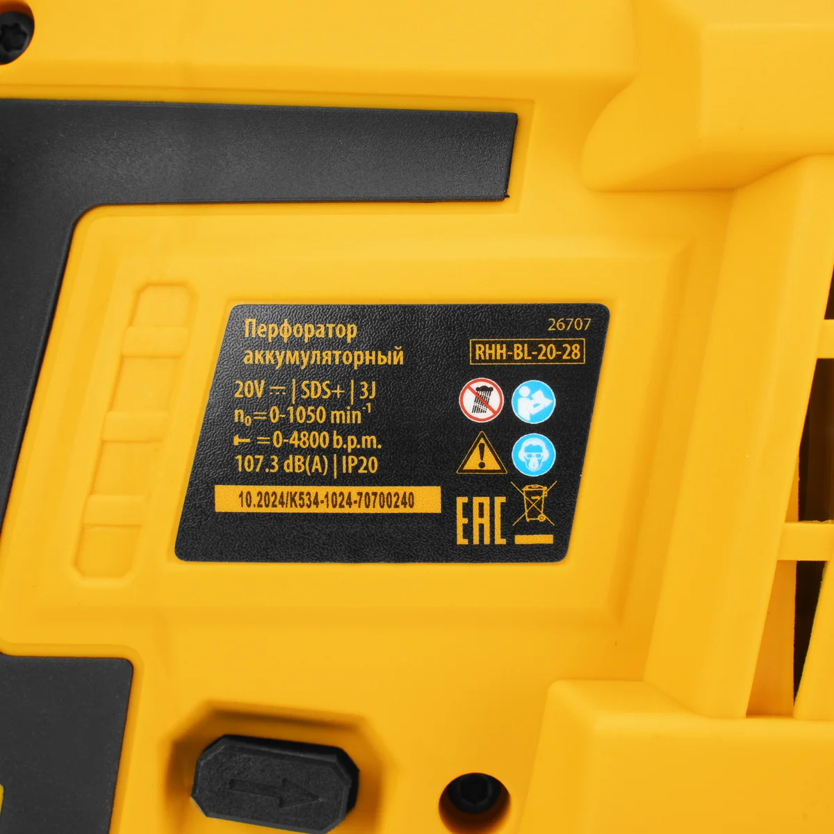 Аккумуляторный перфоратор Denzel RHH-BL-20-28 26707 питается от батареи Li-Ion 20 В, бесщеточный двигатель обеспечивает силу удара 3 Дж. Используется для сверления и бурения отверстий в различных материалах, а также для разрушения кирпичной кладки, штробления бетона, камня и кирпича. Максимальный диаметр отверстий в древесине составляет 40 мм, металле — 13 мм, бетоне — 28 мм. Можно выбрать один из трех режимов работы: долбление, сверление и сверление с ударом. Угловое положение долота регулируется для наиболее эффективной работы. Максимальная частота вращения составляет 1050 об/мин, ударов — 4800 уд/мин. Мощный и долговечный бесщеточный двигатель обеспечивает стабильную работу и высокую производительность в течение длительного времени. Инструмент пригодится для проведения строительных работ в быту.