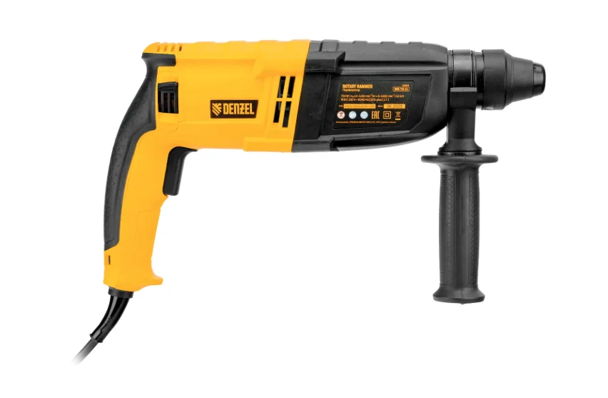 Электрический перфоратор Denzel RHB-750-24 26604 мощностью 750 Вт предназначен для оснастки с хвостовиком SDS Plus, имеет энергию удара 2,7 Дж и работает в одном из 3 режимов (сверление, бурение, долбление) + функция изменения положения долота. Позволяет сверлить отверстия, бурить кирпичную кладку, камень и бетон, штробить стены, удалять старые покрытия (плитку), проводить демонтажные работы. Максимальный диаметр сверления в бетоне составляет 24 мм, в древесине — 30 мм, стали — 13 мм. Также перфоратор совместим с коронками диаметром до 68 мм.