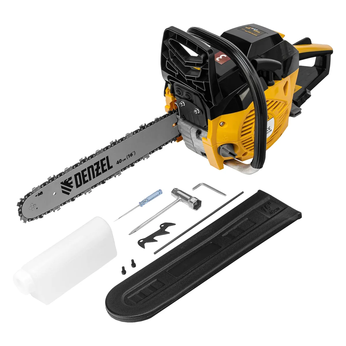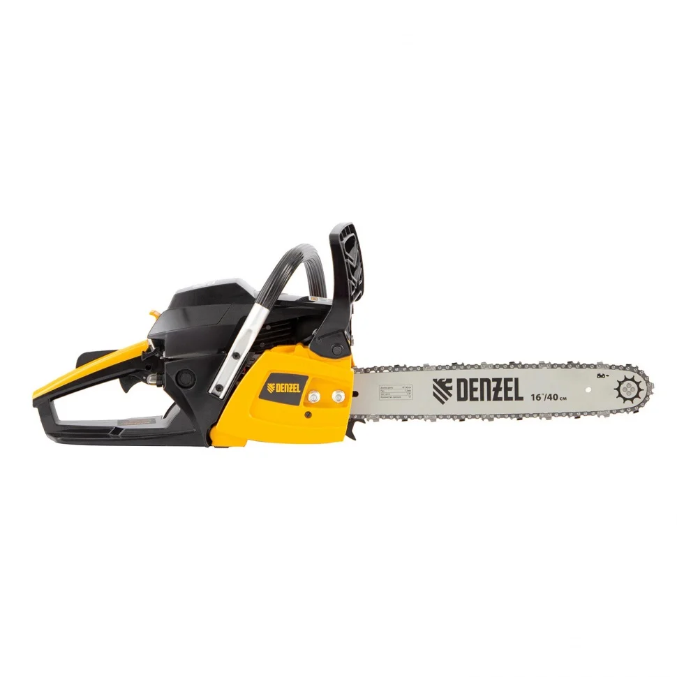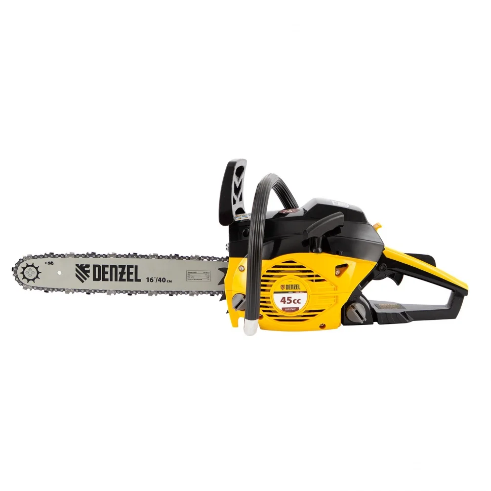 Пила цепная бензиновая Denzel DGS-4516 95230 с двигателем объемом 45 см3 и мощностью 3,0 л.с. поставляется с шиной длиной 40 см и цепью с 57 звеньями (шаг 3/8″, паз 1,3 мм). Это бытовой инструмент для заготовки дров, обрезки ветвей и сучьев в саду, распила древесины твердых и мягких пород. Пила выдерживает интенсивные нагрузки, используется во время строительных и ремонтных работ, будет полезна на дачном участке.