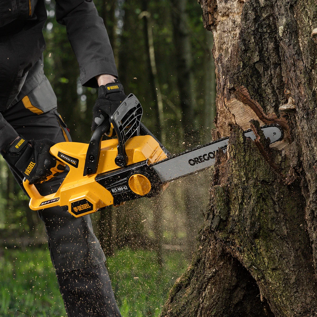 Пила цепная аккумуляторная Denzel RCS 400-62 58620 с шиной длиной 400 мм работает от аккумулятора Li-Ion с рабочим напряжением 62 В. Предназначена для заготовки дров, срезания массивных веток, валки деревьев, распиливания материалов из древесины любых пород. Мощный бесщеточный двигатель обеспечивает скорость вращения шпинделя 10500 об/мин, благодаря чему пила отличается высокой производительностью.