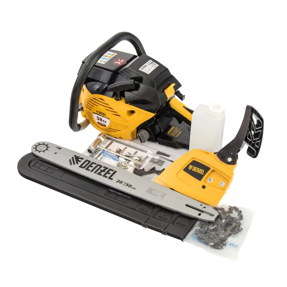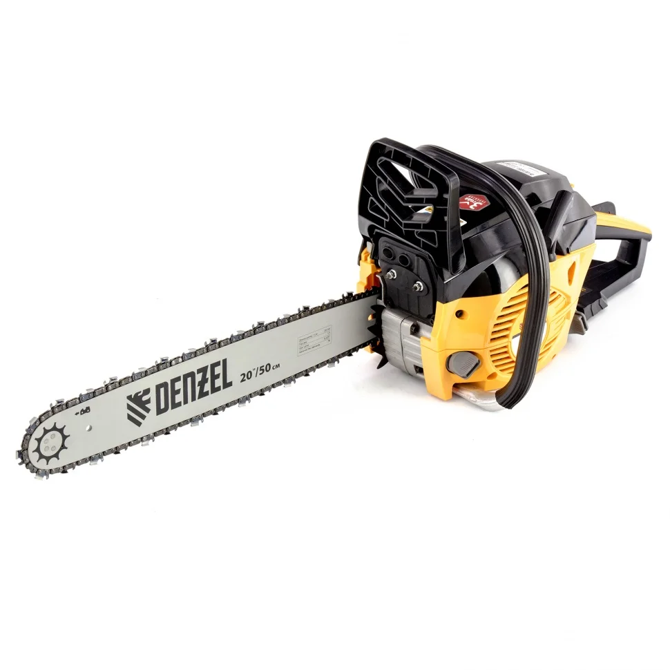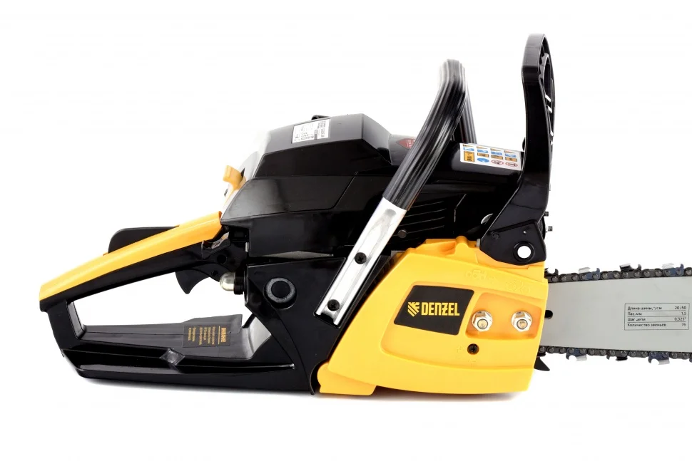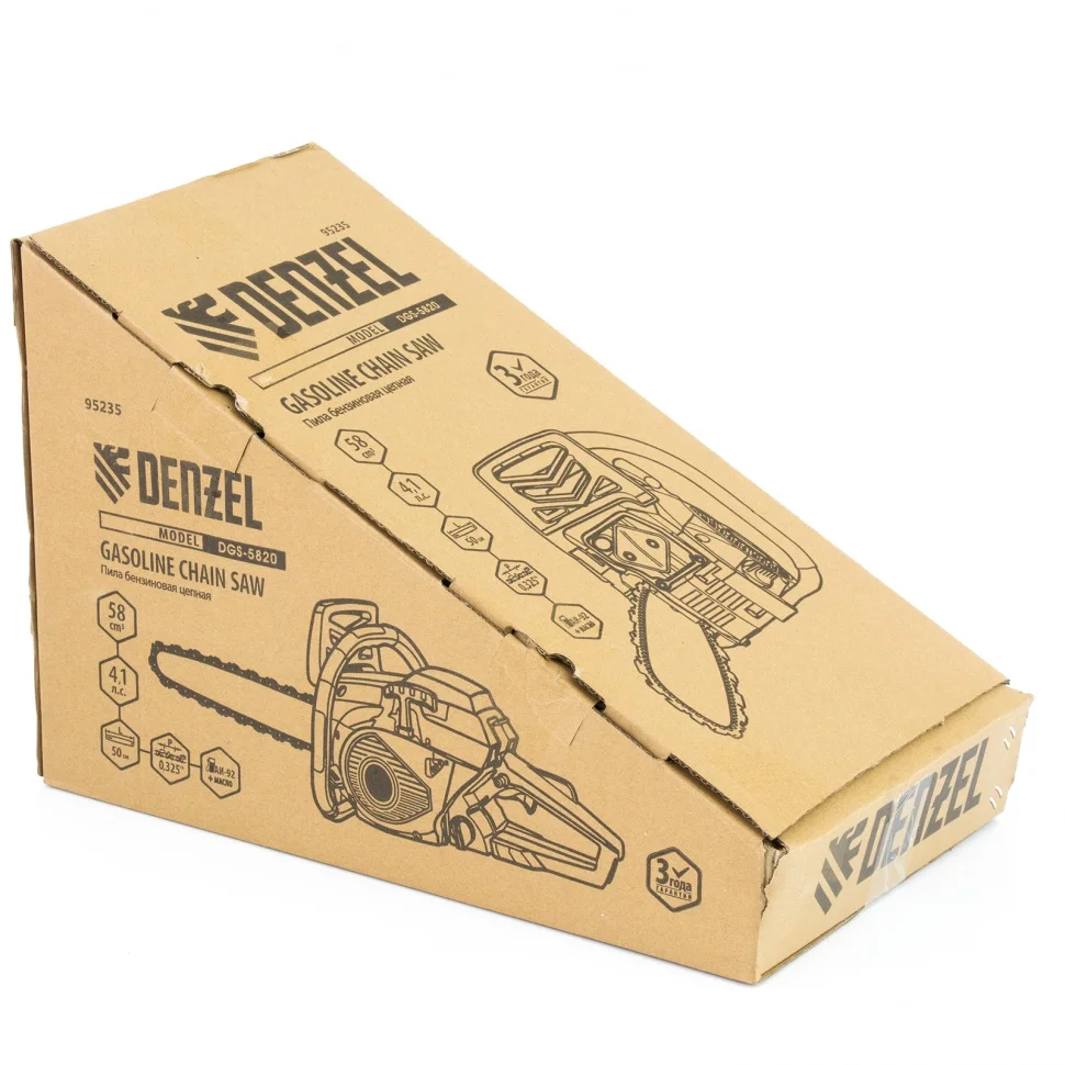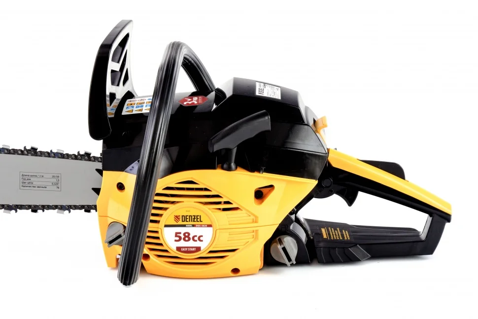 Пила цепная бензиновая Denzel DGS-5820 95235 с двигателем объемом 58 см3 и мощностью 4,1 л.с. поставляется с шиной длиной 50 см и цепью с 76 звеньями (шаг 0,325″, паз 1,5 мм). Это полупрофессиональный инструмент для заготовки дров, обрезки ветвей и сучьев в саду, распила древесины твердых и мягких пород. Пила выдерживает интенсивные нагрузки, используется во время строительных и ремонтных работ, будет полезна на дачном участке.