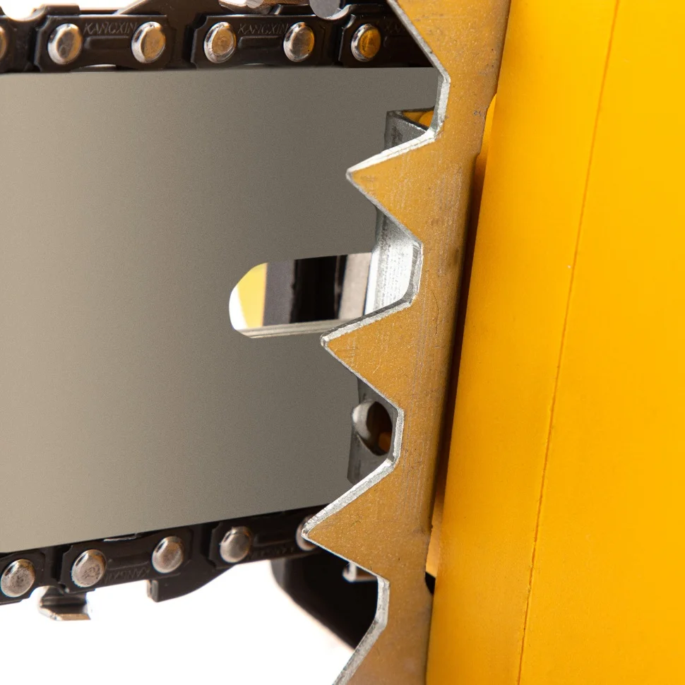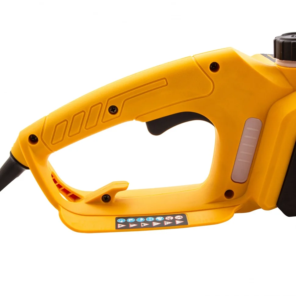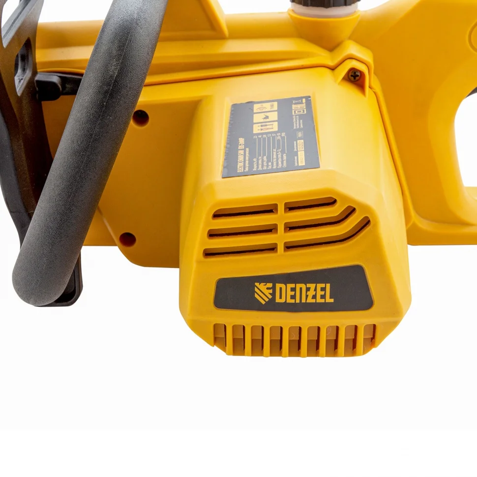 Пила цепная электрическая Denzel EDS-2000P 95616 мощностью 2 кВт, с поперечным расположением двигателя, комплектуется шиной длиной 40 см с 57 звеньями (шаг 3/8″, паз 1,3 мм). Предназначена для заготовки дров, распиливания готовых материалов, подравнивания ветвей в саду, ремонта и частного строительства.Инструмент работает от электросети и не производит вредных выбросов в окружающую среду, поэтому может использоваться в закрытых помещениях, например, в частных мастерских. Процесс запуска максимально упрощен — не нужно готовить топливную смесь, достаточно подключить пилу к сети, и она будет готова к работе. ПреимуществаУдобное использование — поперечное расположение двигателя, небольшие габариты 84 х 26,5 х 18,5 см и малый вес 4,97 кг облегчают работу и позволяют пилить в вертикальной плоскости.Безопасность — двойная защита от случайного пуска и моментальное отключение двигателя при отскоке пилы снижают риск травмирования.Быстрая подготовка к работе — снять и зафиксировать шину, натянуть или заменить цепь можно без ключа.Эффективный рез — пильная гарнитура произведена с контролем термообработки стали, поэтому долго держит заточку.Автоматическое смазывание цепи — масло подается в необходимом количестве в зависимости от нагрузки, что предотвращает преждевременный износ ходовых частей.Полупрозрачный масляный бак — удобно контролировать уровень масла и вовремя доливать его, ориентируясь на отметку max.Надежное удерживание пилы — стальной зубчатый упор служит точкой опоры, уменьшая нагрузку на пользователя и позволяя получить аккуратный срез.Антивибрационная система — прочное крепление ручек к корпусу, мягкое покрытие передней ручки и специальные амортизаторы в конструкции пилы уменьшают отдачу и позволяют работать с комфортом.Надежность — благодаря медной обмотке двигатель работает без риска перегрузки и перегрева даже при высоких нагрузках.Безопасное хранение и транспортировка — пильная шина поставляется в жестком чехле.Держатель кабеля — удлинитель фиксируется с помощью крючка на задней рукоятке, поэтому риск его попадания под шину исключен.Легкое обслуживание — крышка двигателя легко снимается для осмотра, замены щеток и очистки моторного отсека.Гарантия 3 года — высокое качество электропилы подтверждено производителем.