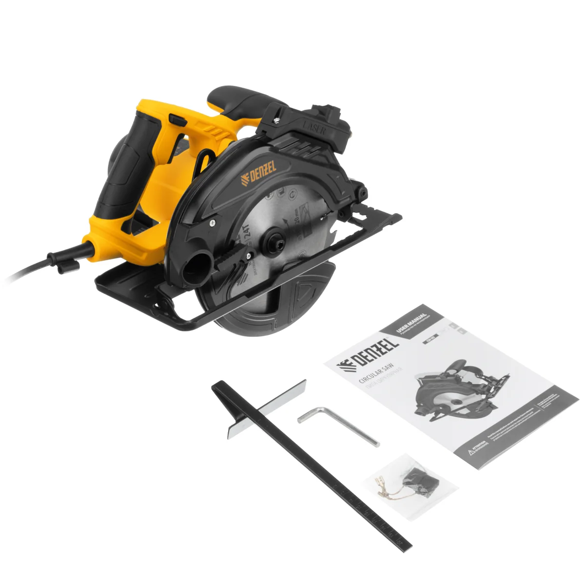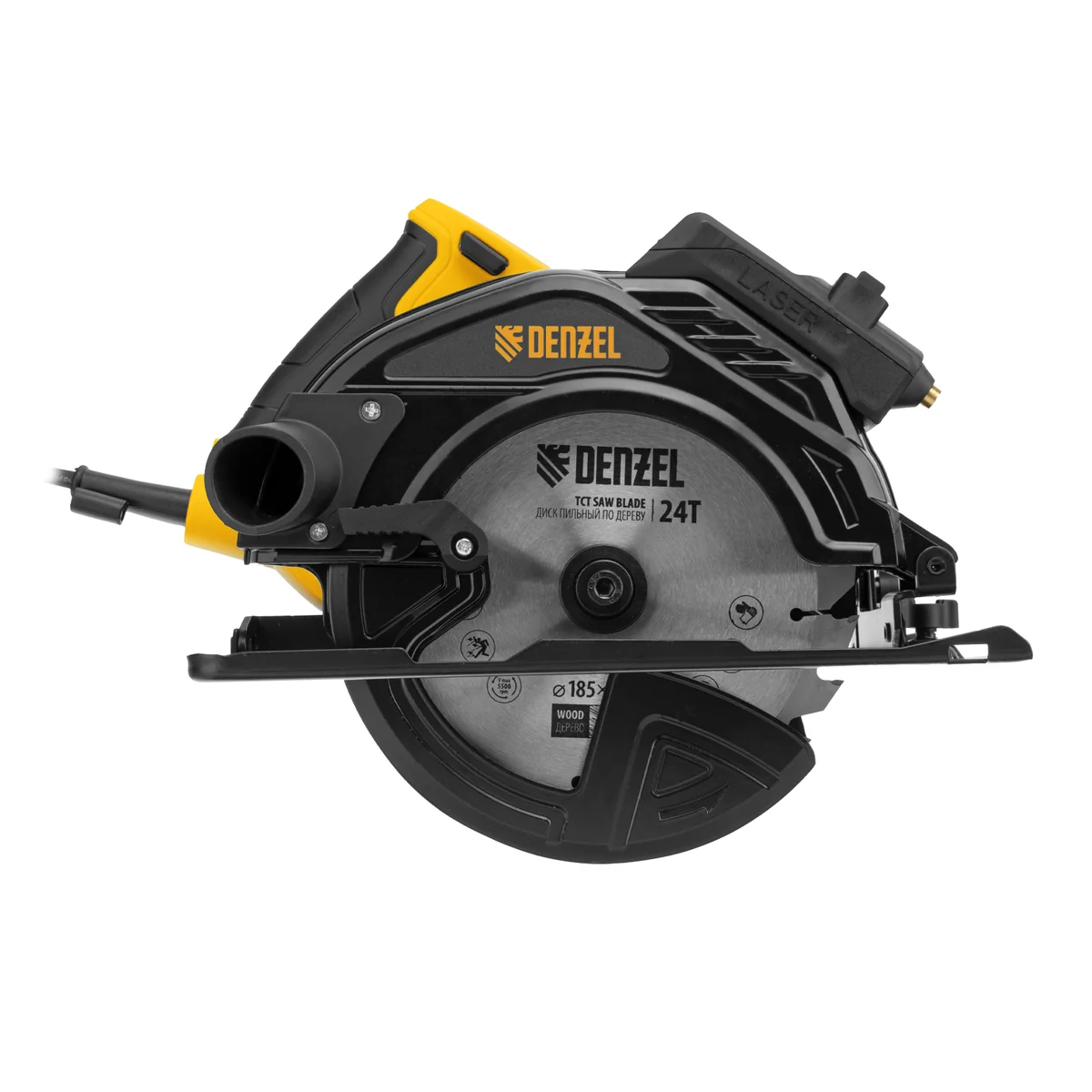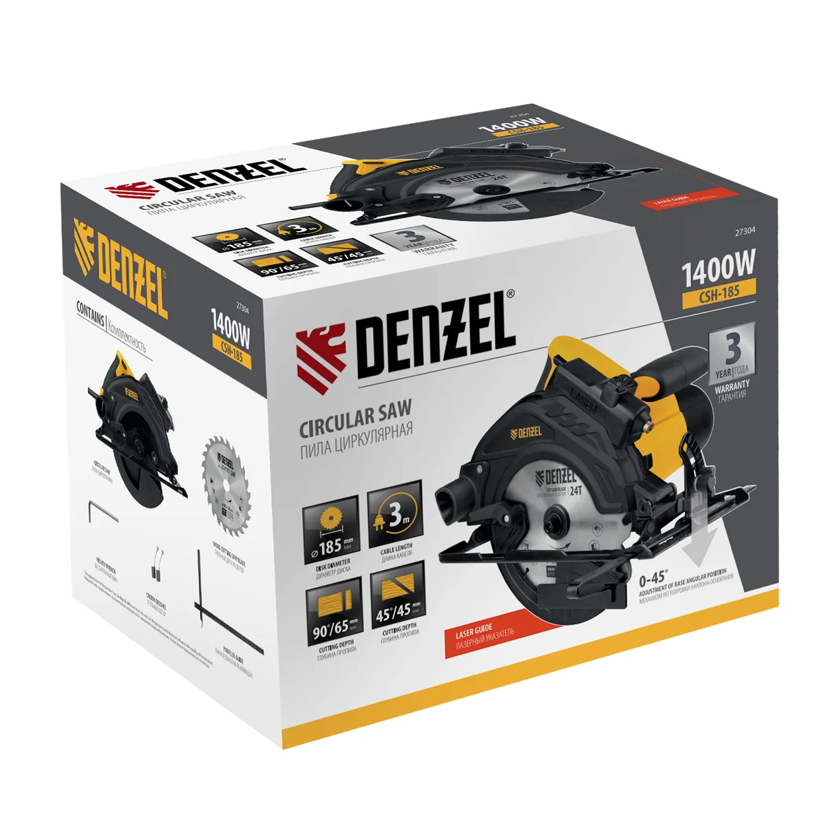 Циркулярная пила Denzel CSH-185 27304 мощностью 1400 Вт используется с дисками диаметром 185 мм и предназначена для распила древесных материалов: досок, фанеры, ДСП, ДВП. Глубина пропила под углом 90° составляет 65 мм. Диск вращается со скоростью 5500 об/мин, что обеспечивает высокую производительность. Инструмент пригодится в мастерской, на даче и строительной площадке.ПреимуществаФункциональность — пила способна выполнять не только прямой распил, но и распил под углом 45°.Надежная конструкция — подошва выполнена из прочной стали.Безопасность пользователя — блокировка пуска предотвращает случайное включение пилы.Блокировка шпинделя — замена диска безопасна и не занимает много времени.Точная работа — лазерный указатель линии пропила позволяет производить ровный рез без предварительной разметки.Чистота на рабочем месте — конструкцией предусмотрена возможность подключения пылесоса для эффективного удаления опилок.Комфортная эксплуатация — кнопка пуска фиксируется в нажатом положении, что снижает нагрузку на руки.Небольшой вес 4,7 кг — инструмент удобно удерживать в руках, длительная работа не вызывает усталости.Гарантия 3 года — высокое качество циркулярной пилы подтверждено производителем.