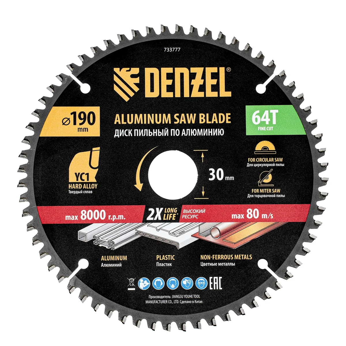 Пильный диск Denzel 733777 диаметром 190 x 30 мм, с 64 зубьями, предназначен для точного распиливания заготовок из алюминия, пластика, цветных металлов. Устанавливается на циркулярную или торцовочную пилу, также возможно использование с распиловочным станком. Зубья трапециевидно-плоского типа (TCG) с отрицательным углом заточки обеспечивают ровный рез без сколов. В комплект поставки входит переходное кольцо 30/20 мм, позволяющее изменить посадочный диаметр при необходимости.