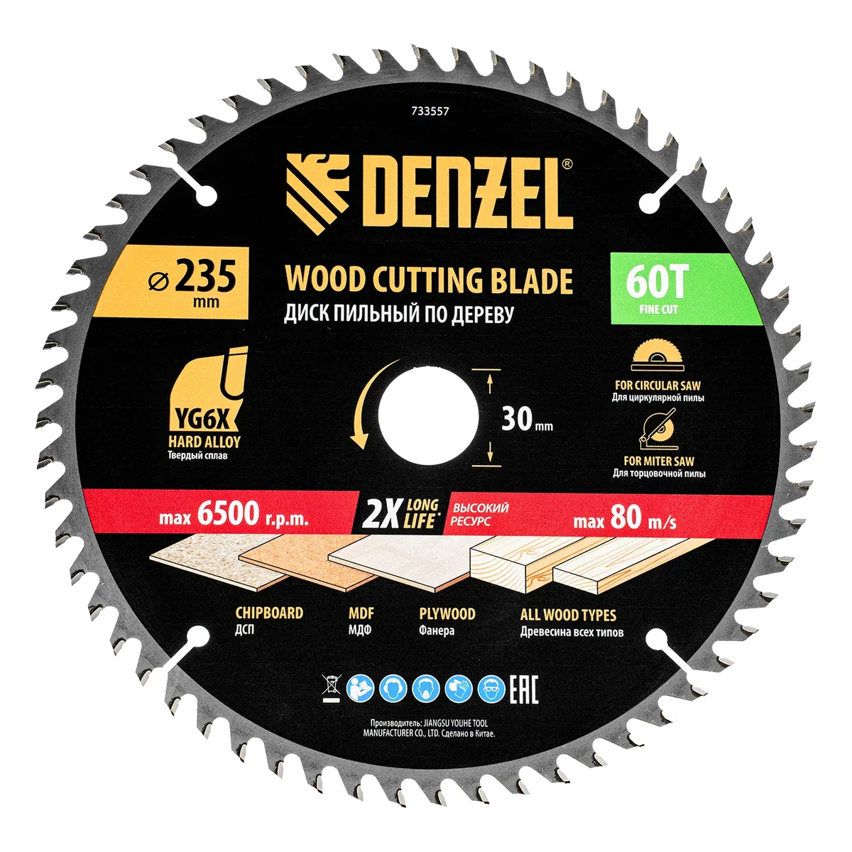 Пильный диск Denzel 733557 диаметром 235 x 30 мм, с 60 зубьями, предназначен для точного продольного и поперечного распила твердой и мягкой древесины, фанеры, МДФ, ДСП. 60 зубьев типа ATB с режущими пластинами оптимальной геометрии обеспечивают чистый рез. Режущие пластины из твердого сплава YG6X сохраняют рабочие свойства при интенсивном использовании. Диск устанавливается на циркулярную, торцовочную пилу или на распиловочный станок. В комплект поставки входит переходное кольцо с 30 на 20 мм, что позволяет изменить посадочный размер и расширяет возможности использования диска.