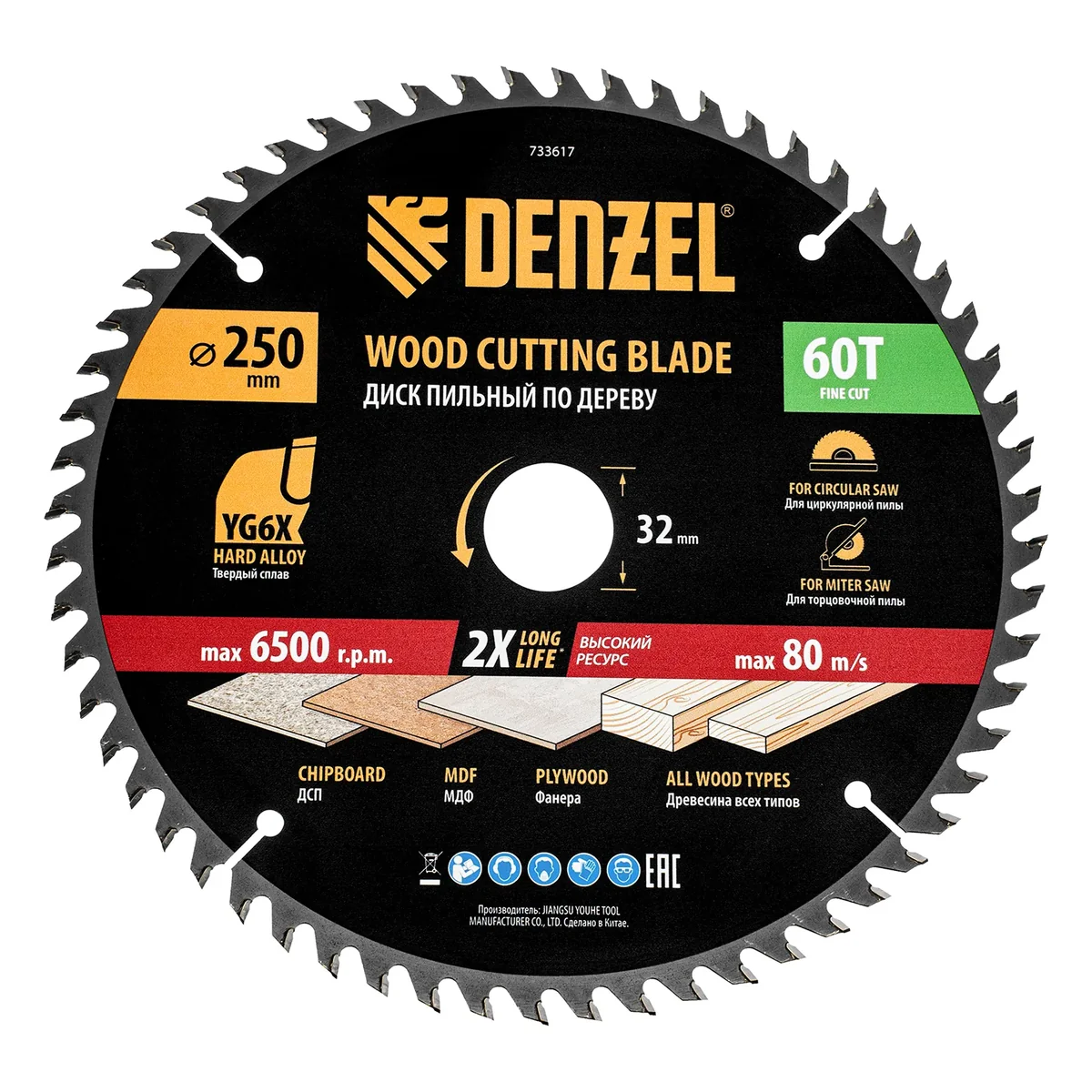 Пильный диск Denzel 733617 диаметром 250 x 32 мм, с 60 зубьями, предназначен для точного продольного и поперечного распила твердой и мягкой древесины, фанеры, МДФ, ДСП. 60 зубьев типа ATB с режущими пластинами оптимальной геометрии обеспечивают чистый рез. Режущие пластины из твердого сплава YG6X сохраняют рабочие свойства при интенсивном использовании. Диск устанавливается на циркулярную, торцовочную пилу или на распиловочный станок. В комплект поставки входит переходное кольцо с 32 на 30 мм, что позволяет изменить посадочный размер и расширяет возможности использования диска.