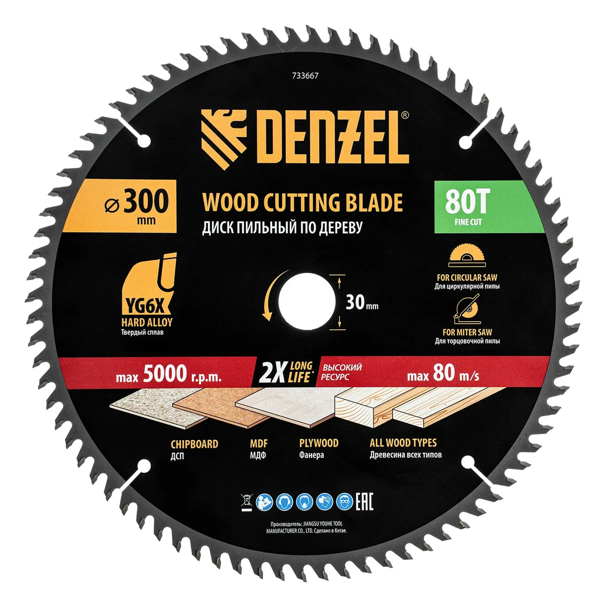 Пильный диск Denzel 733667 диаметром 300 x 30 мм, с 80 зубьями, предназначен для точного продольного и поперечного распила твердой и мягкой древесины, фанеры, МДФ, ДСП. 80 зубьев типа ATB с режущими пластинами оптимальной геометрии обеспечивают максимально чистый рез. Режущие пластины из твердого сплава YG6X сохраняют рабочие свойства при интенсивном использовании. Диск устанавливается на циркулярную, торцовочную пилу или на распиловочный станок. В комплект поставки входит переходное кольцо с 30 на 20 мм, что позволяет изменить посадочный размер и расширяет возможности использования диска.