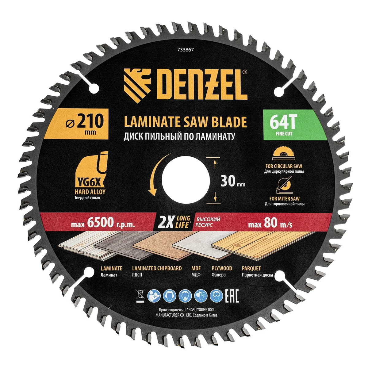 Пильный диск Denzel 733867 диаметром 210 x 30 мм, с 64 зубьями, используется для точного распиливания ламината, ЛДСП, МДФ, фанеры, паркетной доски. 64 мелких трапециевидно-плоских зубьев с положительным углом заточки позволяют эффективно решать поставленные задачи, обеспечивая чистый рез. Диск устанавливается на циркулярную или торцовочную пилу, а также на распиловочный станок. Можно установить оснастку на инструмент с другим посадочным диаметром — для этого предусмотрено переходное кольцо 30/20 мм.