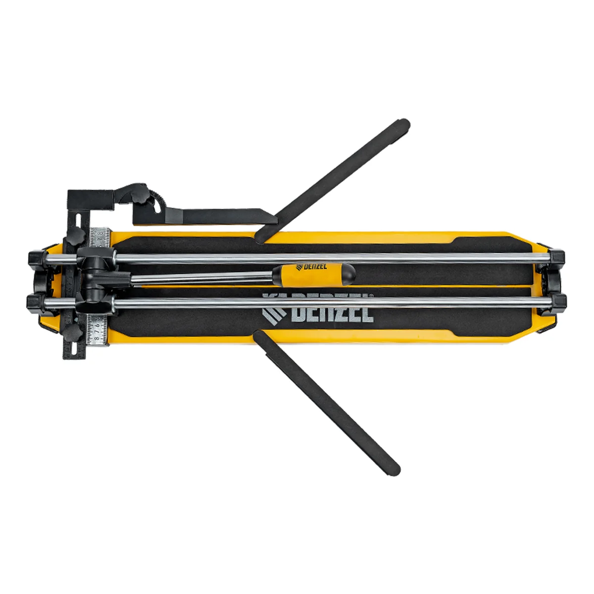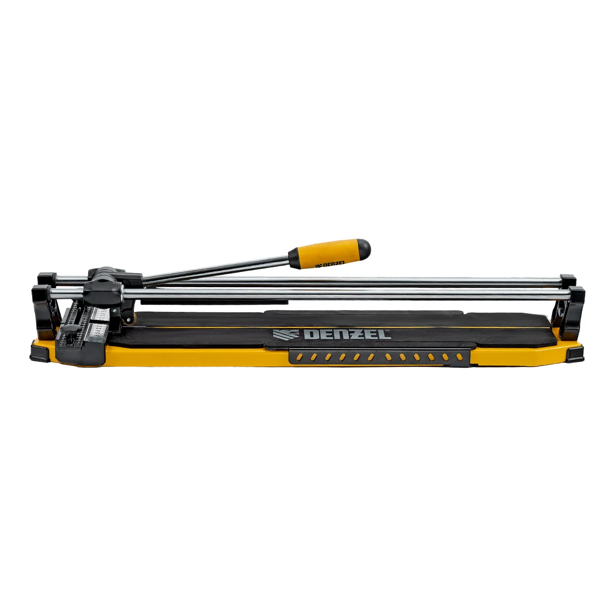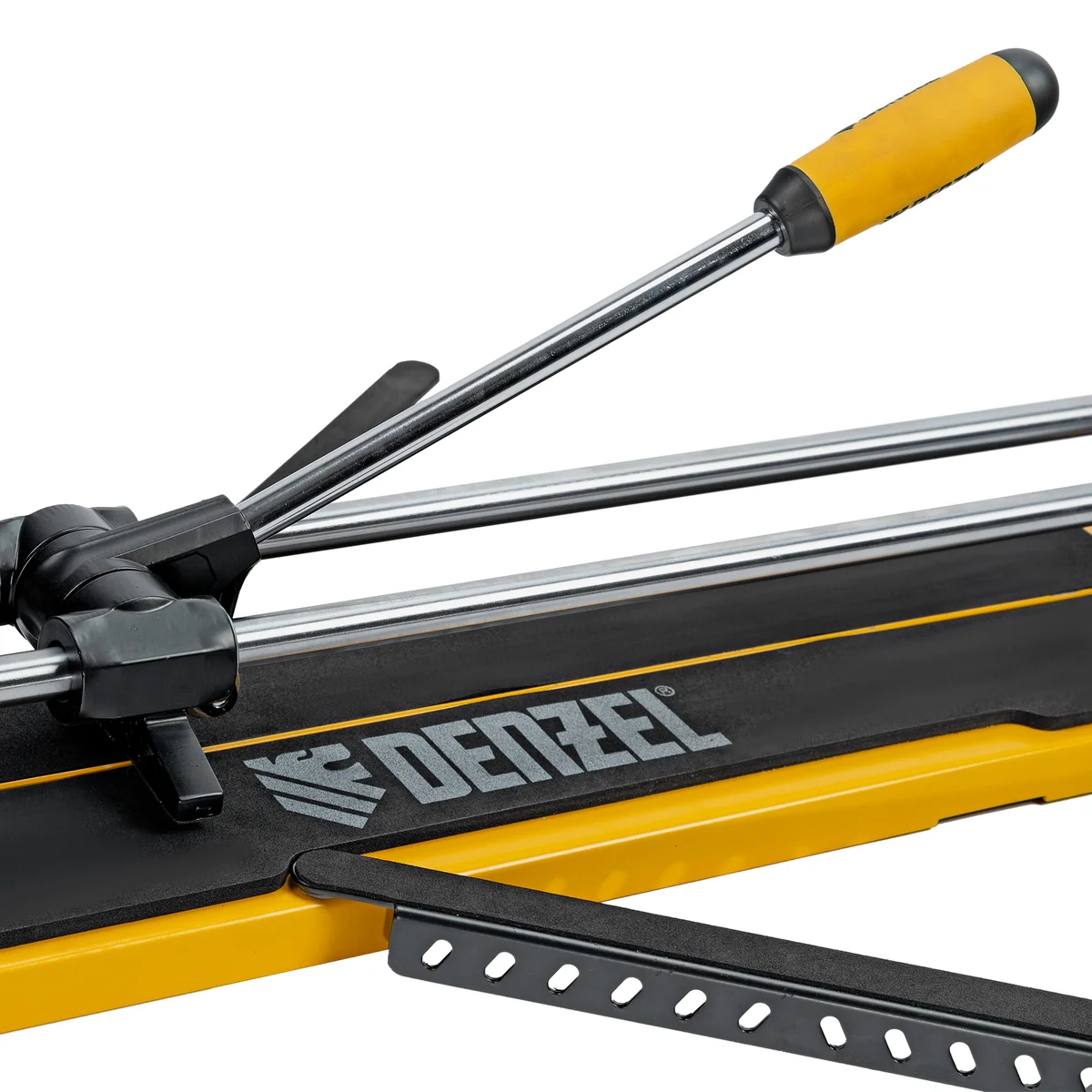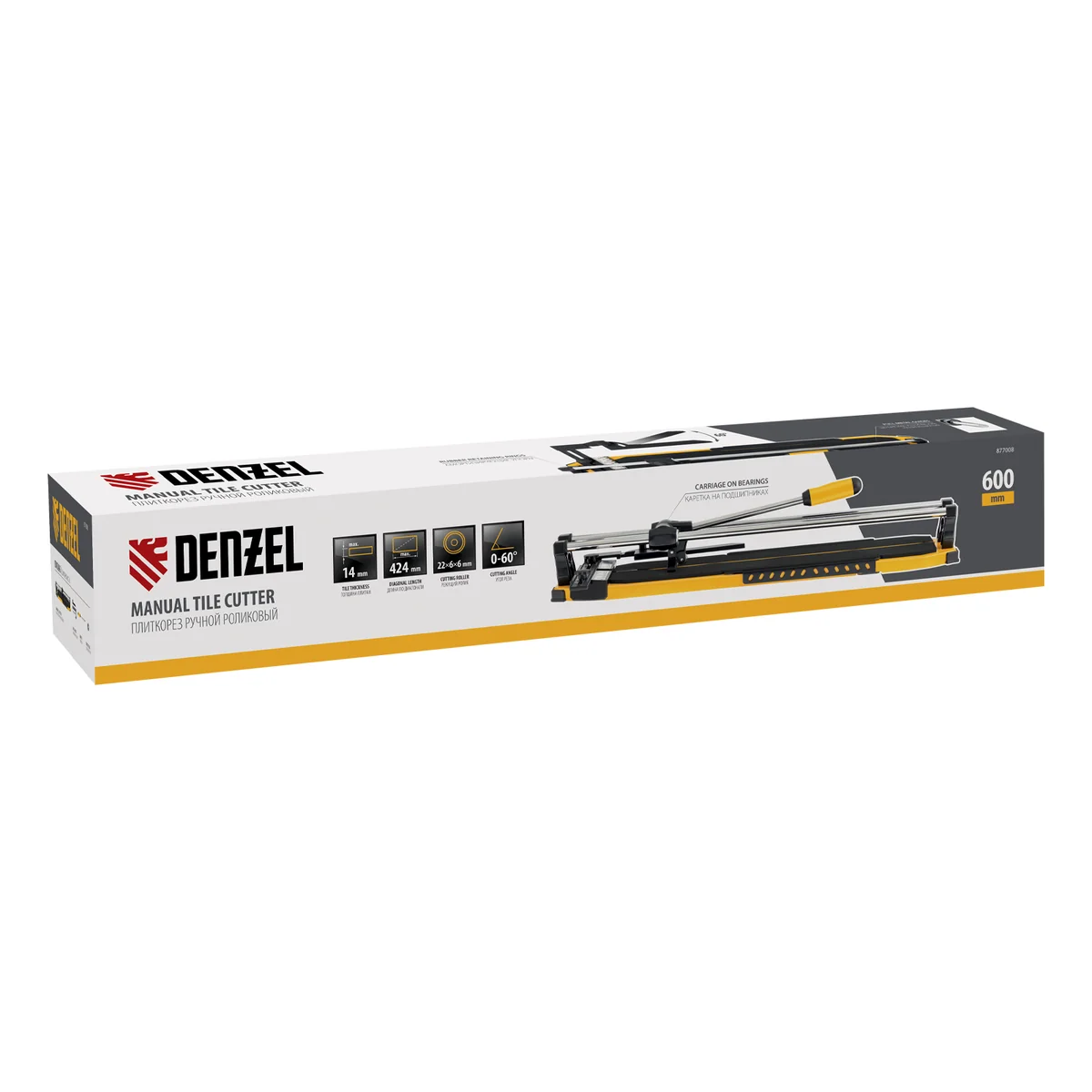 Ручной плиткорез Denzel 877008 с цельнометаллическими направляющими и стальной станиной, с кареткой на подшипниках и рукояткой-пеналом, предназначен для прямой и диагональной резки керамической плитки и керамогранита длиной до 600 мм и толщиной до 14 мм. Раздвижные упоры упрощают работу с плиткой большого размера. Инструмент используется для проведения отделочных работ.