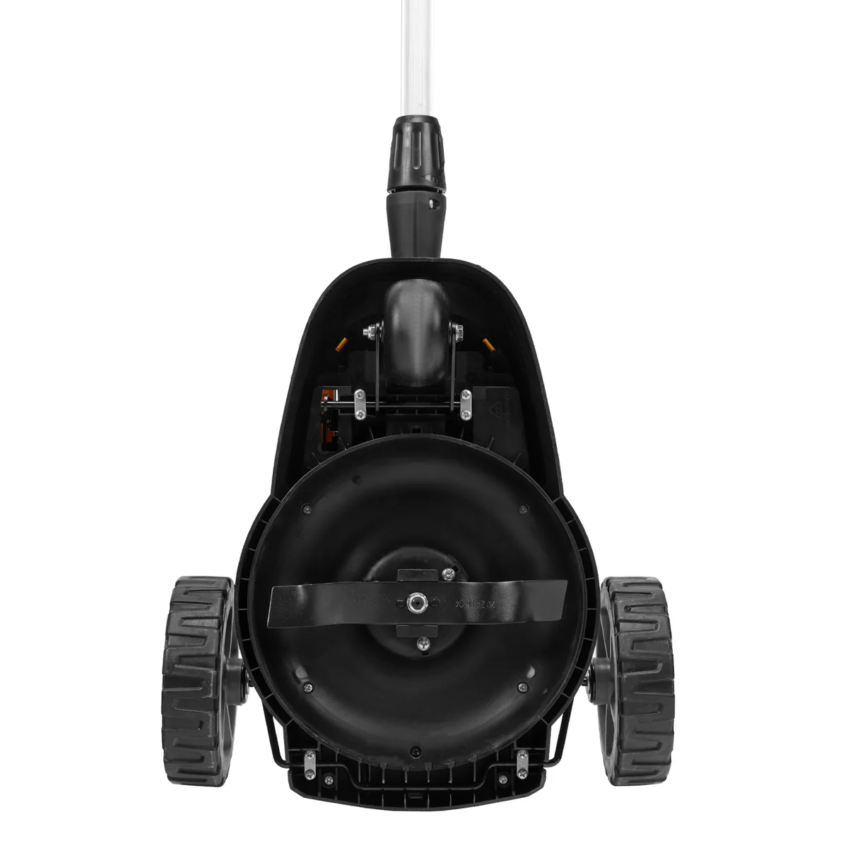 - Полная комплектация — газонокосилка поставляется с аккумулятором, зарядным устройством, а также специальной лопаткой для очистки деки.