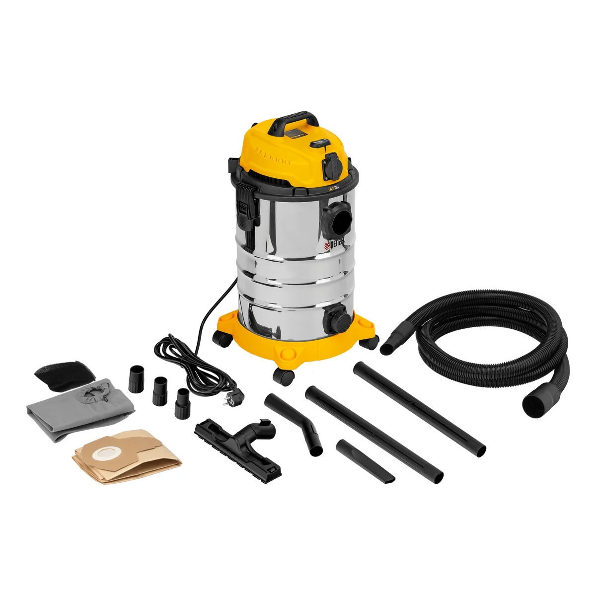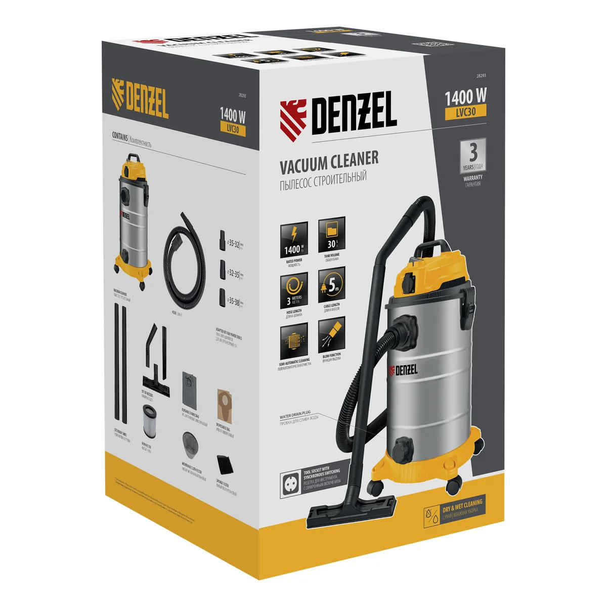 Строительный пылесос Denzel LVC30 28293 мощностью 1400 Вт, со шлангом длиной 3 м и баком объемом 30 л, оснащенный розеткой с автосинхронизацией, предназначен для сухой и влажной уборки помещений: удаления бетонной, кирпичной пыли и других твердых отходов, а также воды. Высокоэффективный HEPA-фильтр задерживает мельчайшие загрязняющие частицы, предотвращая их попадание обратно в воздух. Специальный мембранный фильтр позволяет проводить уборку без использования мешка. Возможность подключения электроинструмента обеспечивает удаление стружки, опилок, шлама, образующихся в процессе сверления, пиления, фрезерования. Пылесос пригодится для поддержания чистоты во время проведения строительных и ремонтных работ, будет полезен на складе, производстве и в гараже.