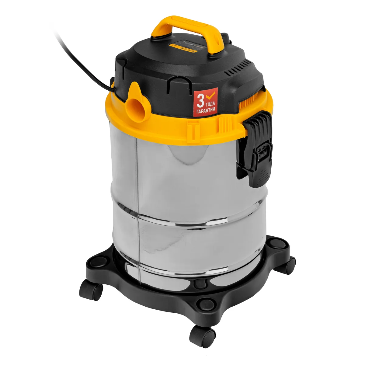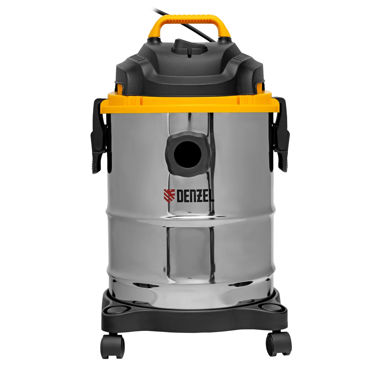 Пылесос строительный Denzel SVC15 28201 мощностью 1200 Вт, с баком объемом 15 л и шлангом длиной 2 м, предназначен для уборки бетонной, кирпичной пыли, опилок, стружки и других твердых отходов. Функция влажной уборки позволяет собирать воду с пола. Пылесос используется во время проведения строительных и ремонтных работ, будет полезен для поддержания чистоты в мастерской, гараже, производственном помещении.ПреимуществаТермозащита — в случае перегрева двигатель автоматически отключается, что предотвращает его поломку.Влагозащита — внутренние компоненты надежно изолированы от попадания пыли и брызг воды по стандарту IP44.Функция выдува — пылесос можно использовать для очистки от мусора дорожек, ступеней, труднодоступных мест, а также для продувки деталей от пыли.Удобная уборка в узком пространстве — в комплект поставки входит щелевая насадка, облегчающая удаление пыли из ящиков, шкафов, отопительных радиаторов и т. д.Автоматический контроль уровня жидкости при влажной уборке — как только количество воды в баке достигает предельно допустимого уровня, срабатывает предохранительный клапан и всасывание прекращается.Широкий комплект поставки — к пылесосу прилагаются фильтры и мешки для мусора, в том числе многоразовый тканевый.Мобильность — благодаря ручке и поворотным колесам пылесос удобно перемещать.Комфортная работа — длина кабеля составляет 5 м, что позволяет свободно передвигаться по рабочей зоне.Гарантия 3 года — высокое качество техники подтверждено производителем.