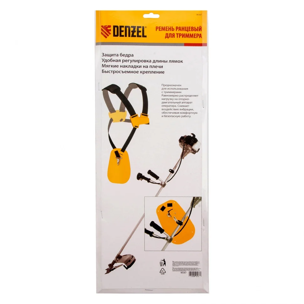 Ранцевый ремень Denzel 96367 с защитой бедра используется с бензиновыми триммерами Denzel. Двухплечевая подвесная система равномерно распределяет вес инструмента, снижая нагрузку на спину, поэтому она подходит для профессиональных работ на участках большой площади.ПреимуществаНадежная защита бедра — жесткая накладка предотвращает удары штанги триммера о ногу.Прочность и долговечность — ремень из износостойкого материала устойчив к истиранию и разрыву.Быстросъемный карабин — подвесная система крепится к триммеру одним движением.Комфортное использование — длину лямок можно отрегулировать под рост пользователя.