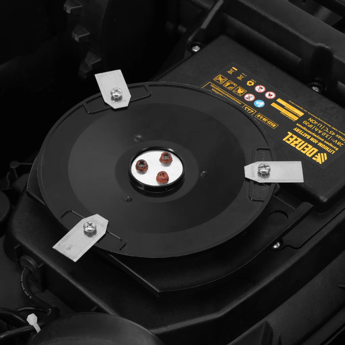 Техника ухаживает за территорией в автономном режиме, без участия пользователя. Перемещается по заранее определенному участку, контур которого задан при помощи ограничительного провода, входящего в комплект поставки. Площадь рабочей зоны составляет 1000 м2. Можно настроить траекторию движения: хаотичную или спиральную. Высота скашивания регулируется в диапазоне 20-60 мм, для этого предусмотрен специальный диск под крышкой в верхней части корпуса.